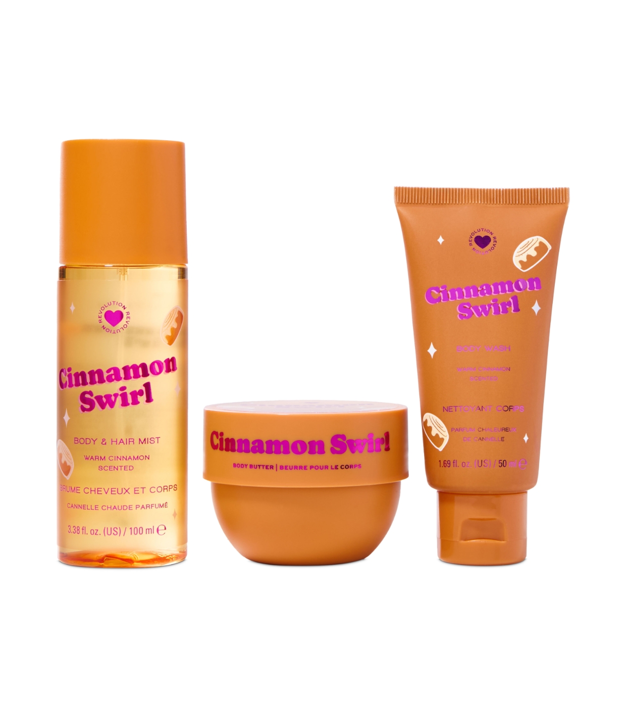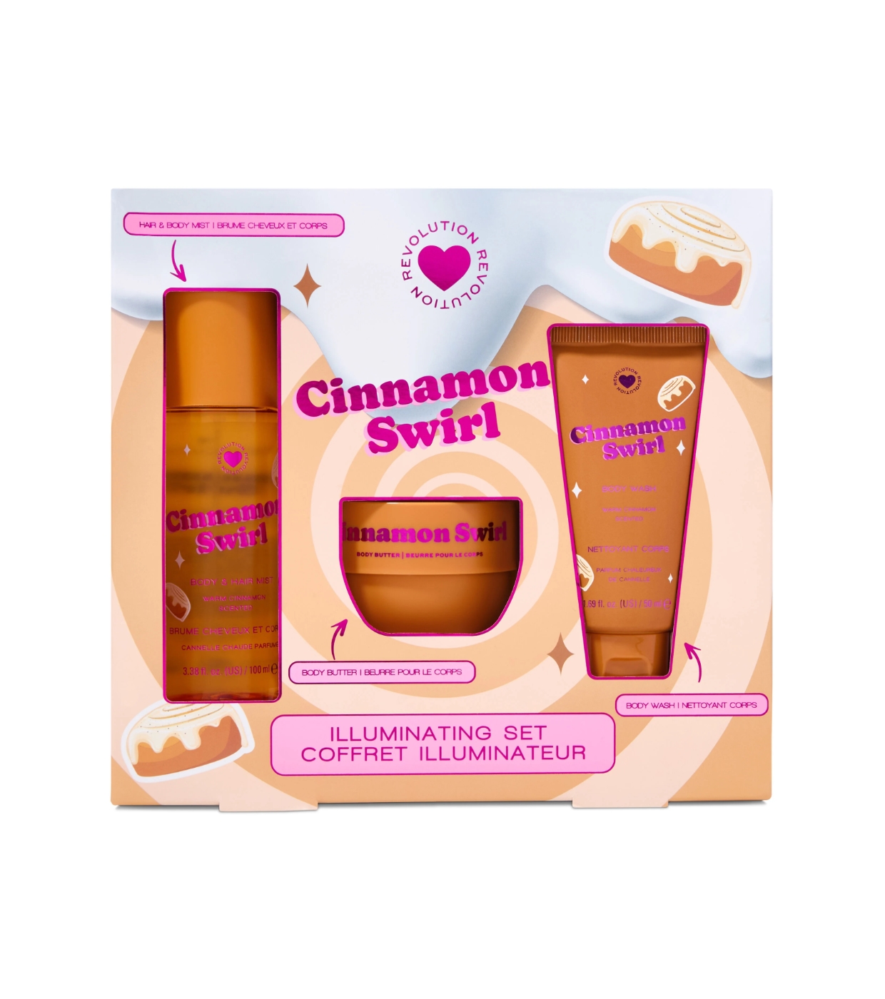 Disfruta de un auténtico capricho goloso para tu piel con el I Heart Revolution Cinnamon Swirl Gift Set, un trío de productos corporales con un irresistible aroma a canela, mantequilla de vainilla y caramelo salado.