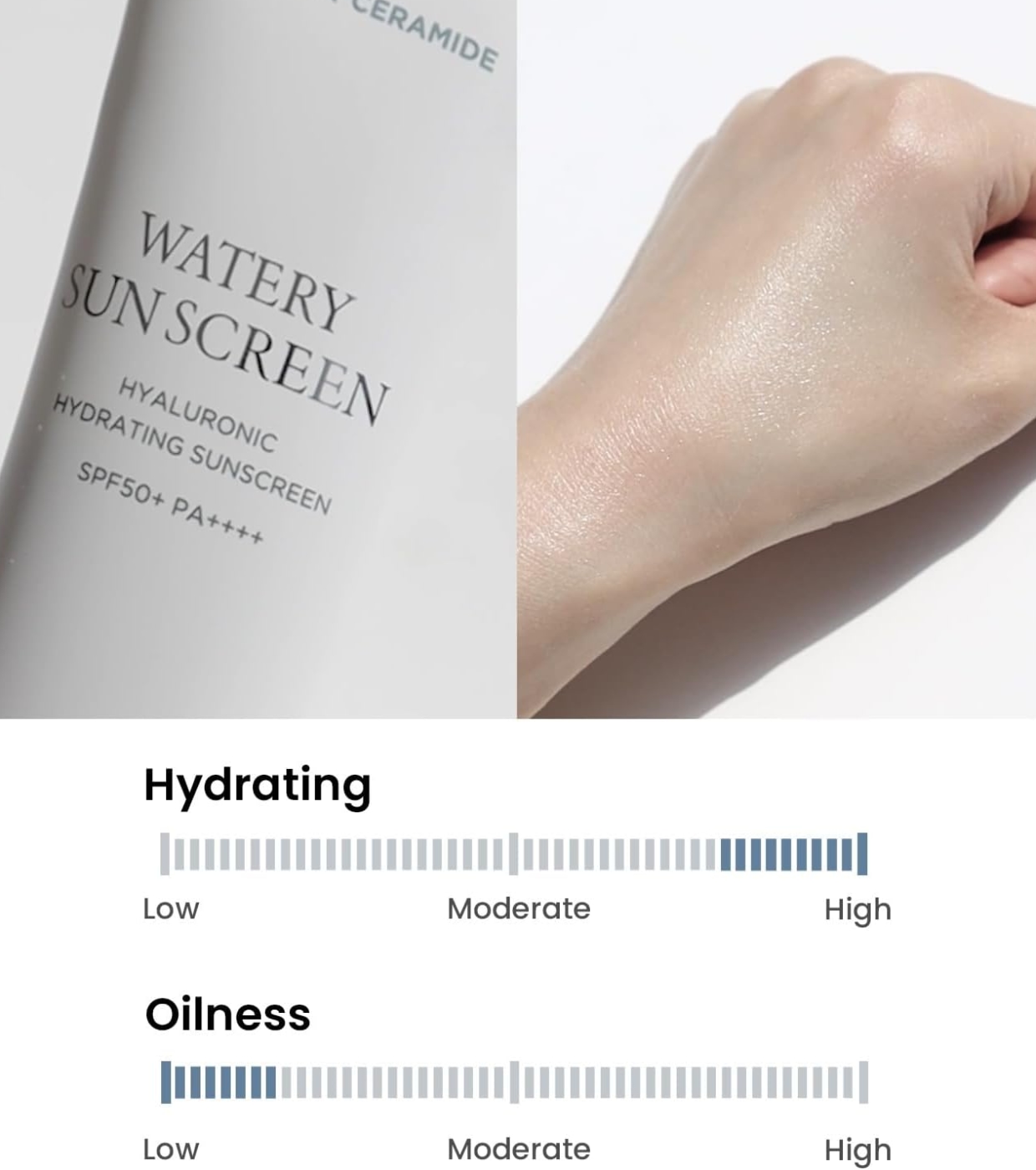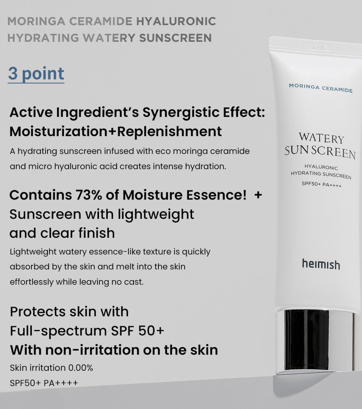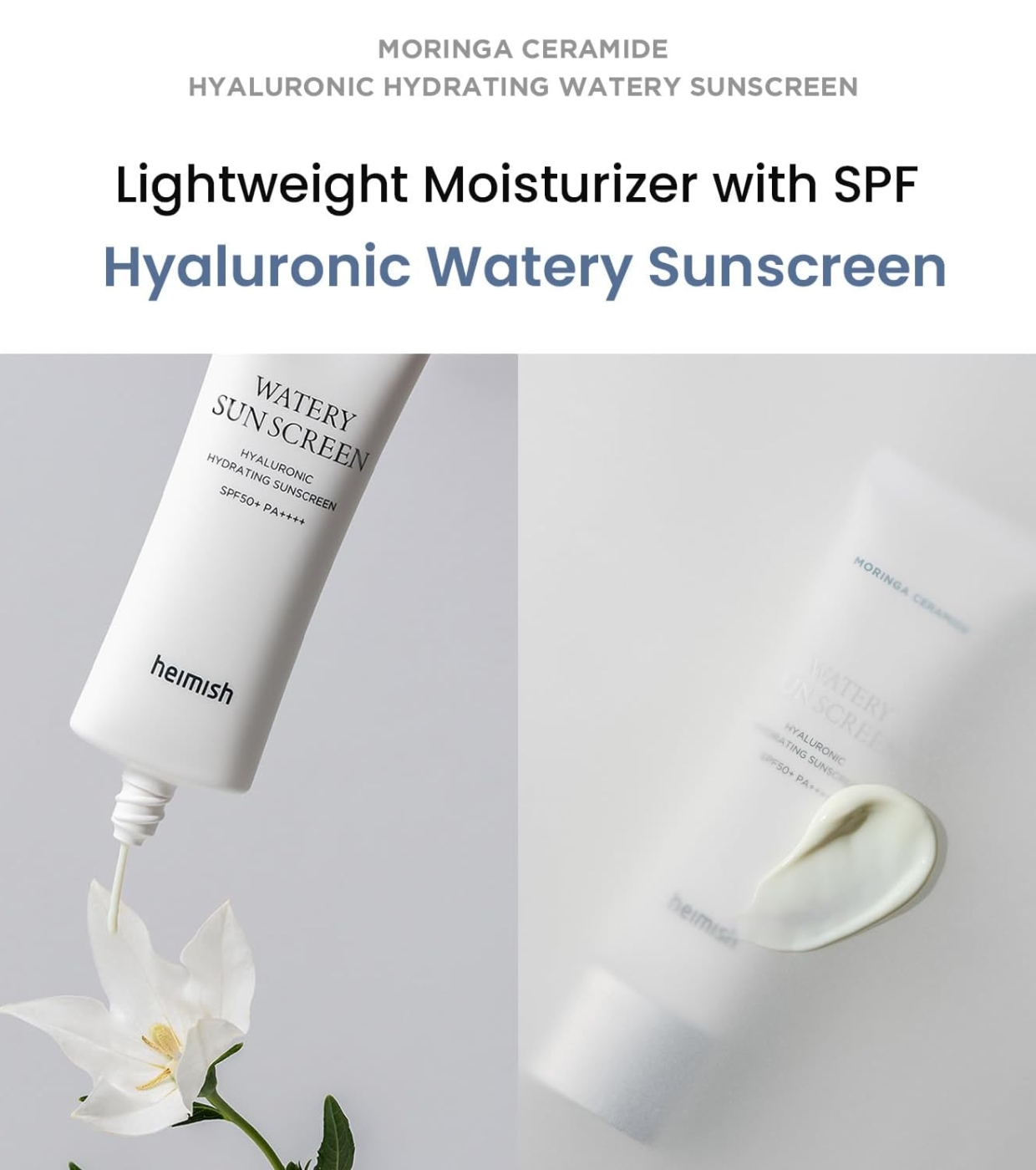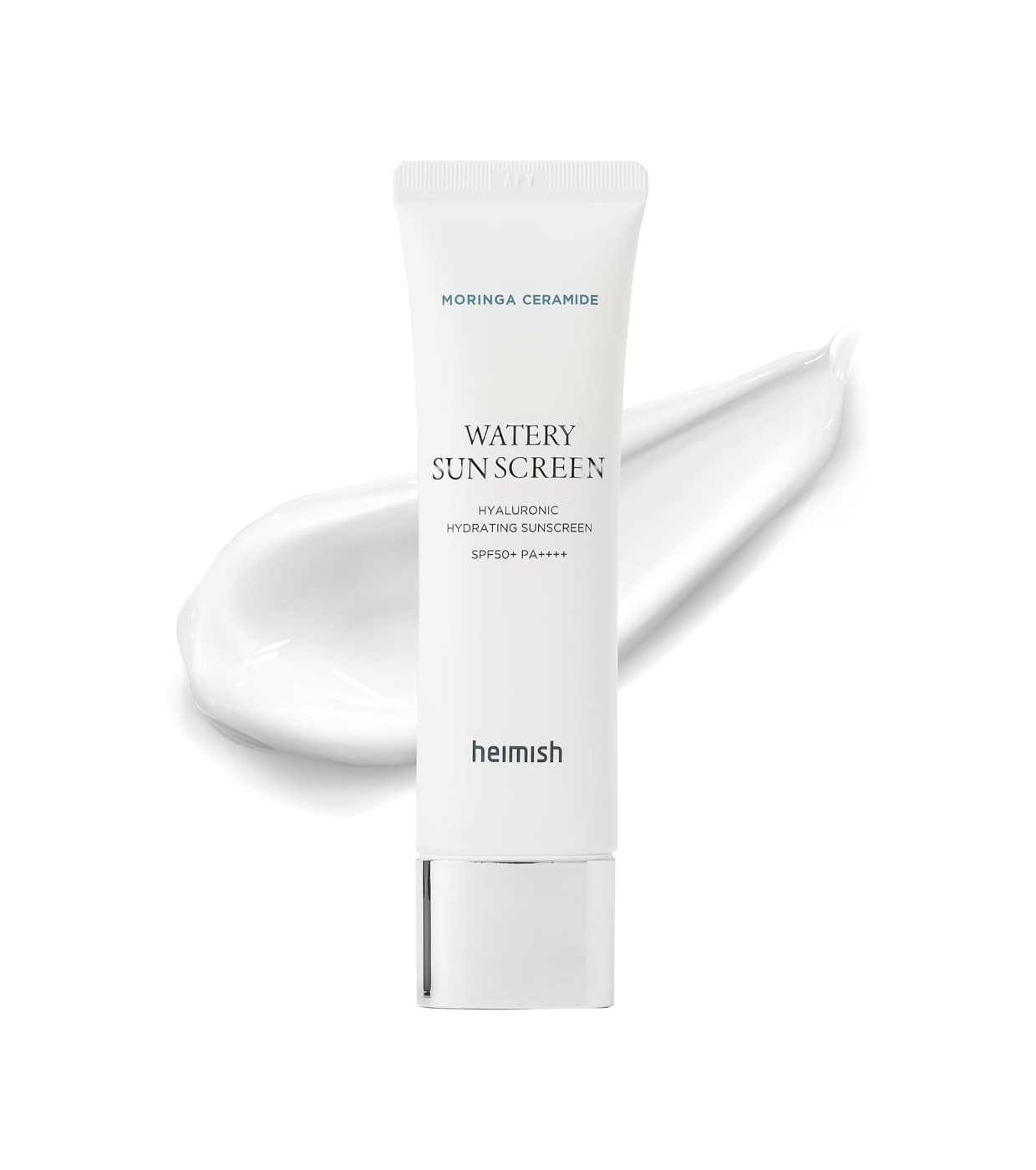 Este protector solar facial Watery Sunscreen SPF50+ PA++++ de Heimish combina una alta protección contra rayos UVA y UVB con una fórmula nutritiva enriquecida con aceite de moringa, ceramidas y microácido hialurónico.