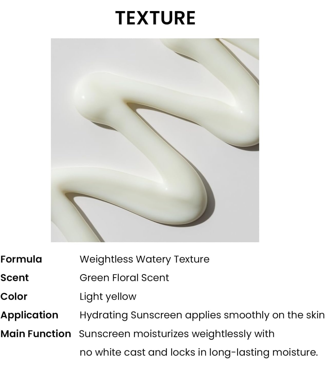 Water, Propanediol, Dibutyl Adipate, Polymethylsilsesquioxane, Diethylamino Hydroxybenzoyl Hexyl Benzoate, Ethylhexyl Triazone, Methylene Bis-Benzotriazolyl Tetramethylbutylphenol, Caprylyl Methicone, Diethylhexyl Butamido Triazone, Pentylene Glycol, 1,2-Hexanediol, Moringa Oleifera Seed Oil, Sodium Hyaluronate, Vincetoxicum Atratum Extract, Butyrospermum Parkii (Shea) Butter, Hydrolyzed Hyaluronic Acid, Hyaluronic Acid, Althaea Rosea Flower Extract, Candida Bombicola/Glucose/Methyl Rapeseedate Ferment, Myrothamnus Flabellifolia Leaf/Stem Extract, Coco-Caprylate/Caprate, Polyglyceryl-3 Methylglucose Distearate, Hydroxyethyl Urea, Decyl Glucoside, Poly C10-30 Alkyl Acrylate, Tromethamine, Acrylates/C10-30 Alkyl Acrylate Crosspolymer, Glycerin, Ethylhexylglycerin, Polyacrylate Crosspolymer-6, Butylene Glycol, Hydroxypropyl Methylcellulose, Acetyl Glucosamine, Hydroxyacetophenone, Octyldodecanol, Tocopherol, Ceramide NP, Dimethylsilanol Hyaluronate, Hydrolyzed Sodium Hyaluronate, Sodium Hyaluronate Crosspolymer, Potassium Hyaluronate, Hydroxypropyltrimonium Hyaluronate, Phytosphingosine, Hydrogenated Lecithin, Sodium Hyaluronate Dimethylsilanol, Sodium Acetylated Hyaluronate, Caprylyl Glycol, Glycine Soja (Soybean) Sterols, Beta-Glucan, Ascorbic Acid, Citric Acid, Behenyl Alcohol, Carbomer, Xanthan Gum, Oleyl Alcohol, Fragrance