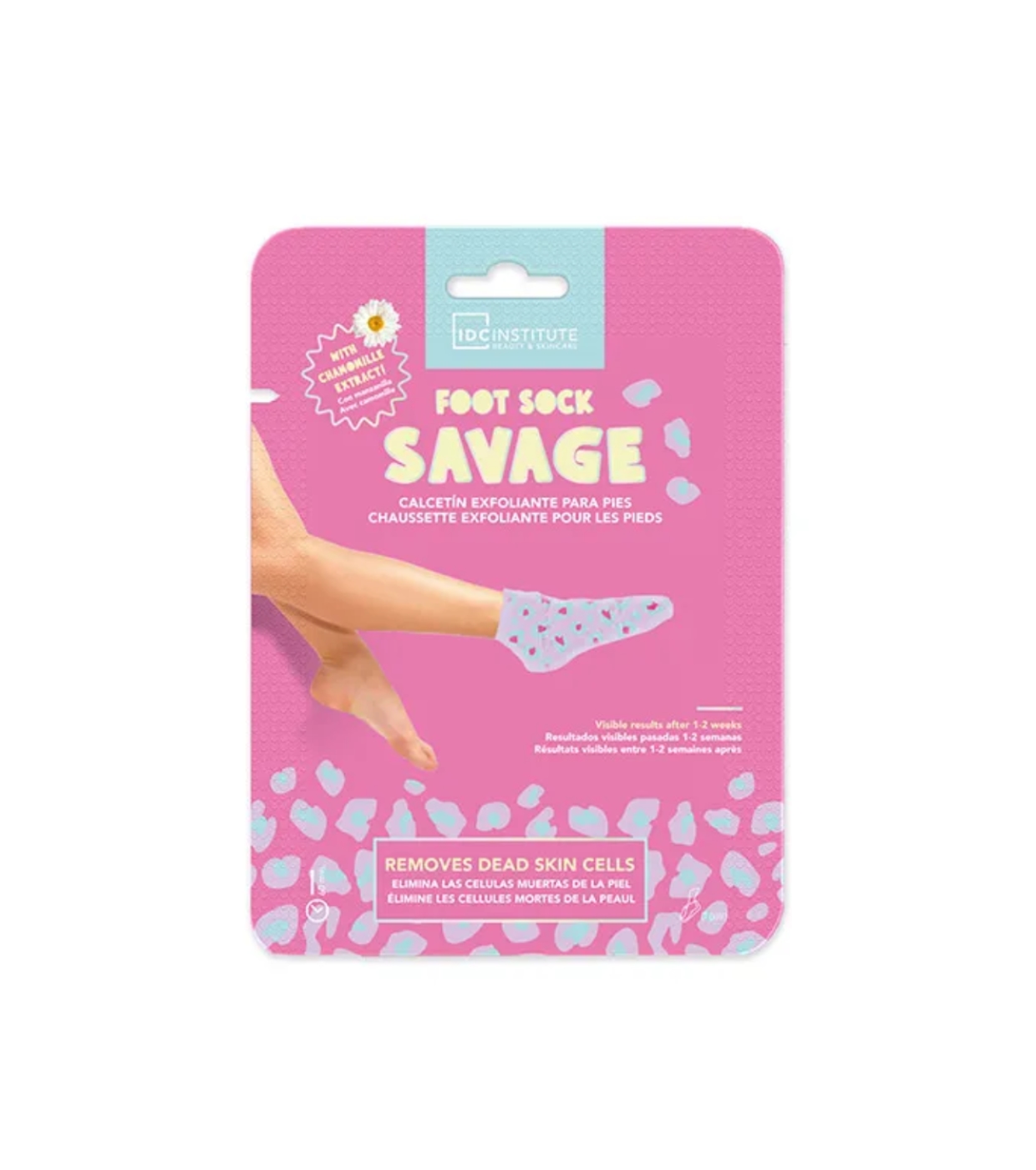 Déjate envolver por una experiencia de spa en casa con este calcetín para pies Savage exfoliante de IDC Institute para pies enriquecida con extracto de camomila.