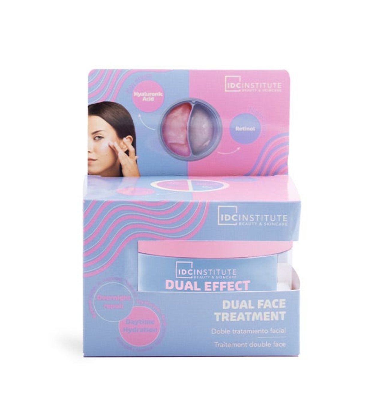 Descubre el cuidado facial completo 24 h con la Dual Effect Day & Night Cream de IDC Institute, una crema innovadora presentada en un práctico envase doble que separa y preserva dos fórmulas específicas para el día y la noche.