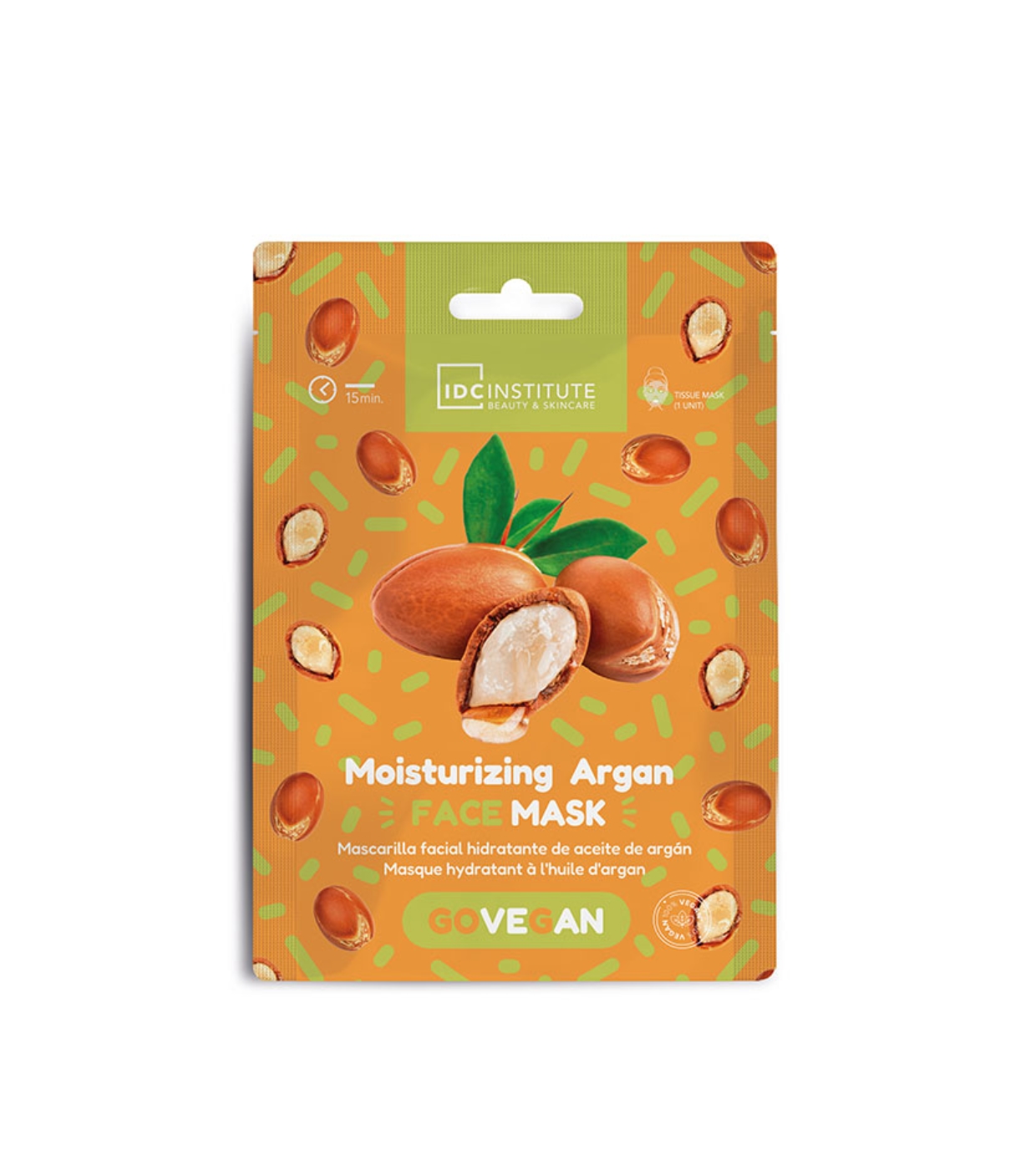 Esta mascarilla facial de IDC Institute en tejido está impregnada con aceite esencial de argán, reconocido por sus propiedades hidratantes y rejuvenecedoras.