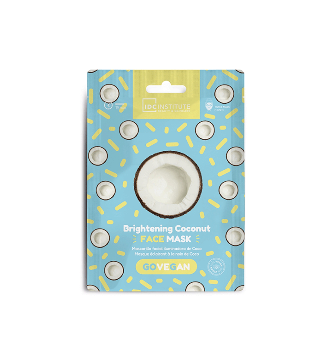 Mascarilla facial de coco de IDC Institute en formato papel, impregnada con aceite de coco, conocida por su poder ultra nutritivo y suavizante.