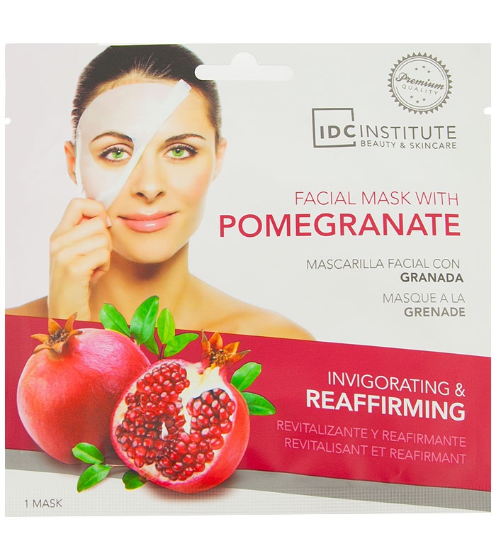 Máscara facial de tejido, pre-cortada y pre-humedecida con nutrientes naturales. Con extracto de granada, de propiedades reafirmantes y revitalizantes.