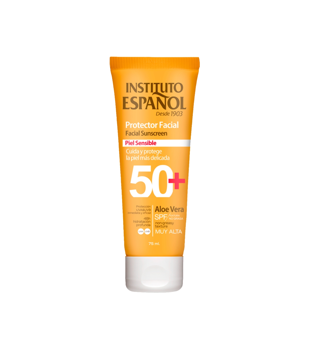 Protege tu piel delicada con el protector solar facial SPF50+ para pieles sensibles de Instituto Español, formulado especialmente para calmar, cuidar y proteger las pieles más reactivas.