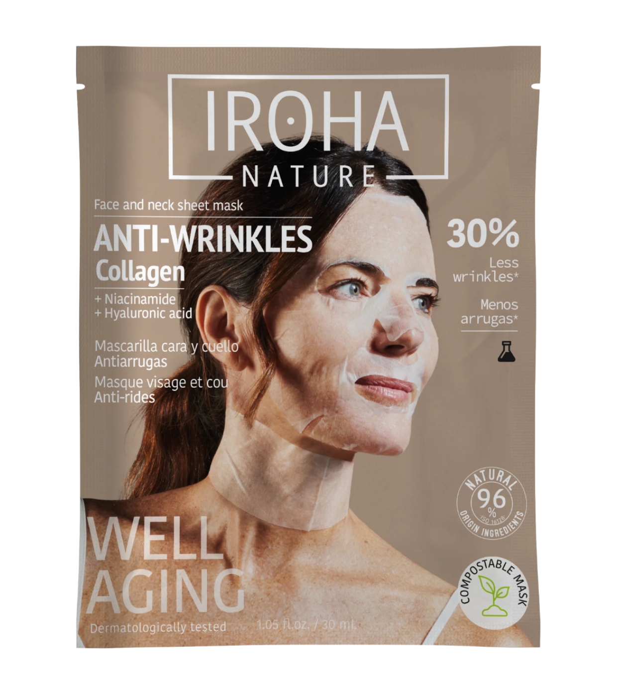Con activos antiedad e hidratantes: colágeno, ácido hialurónico, niacinamida, alantoína.