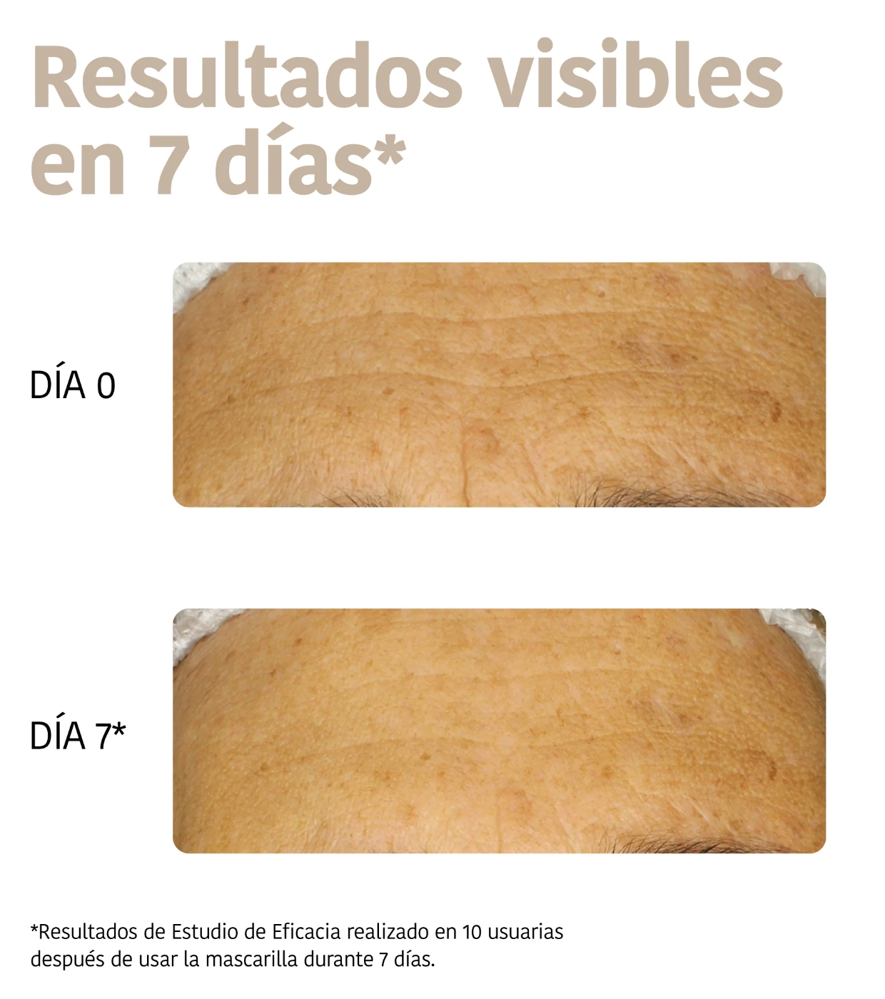 Desdoblar la mascarilla y colocarla sobre el rostro y cuello limpio. Después de 15 minutos retirar y dar un suave masaje para acabar de absorber el sérum. No aclarar la piel. Ideal 1 vez por semana.