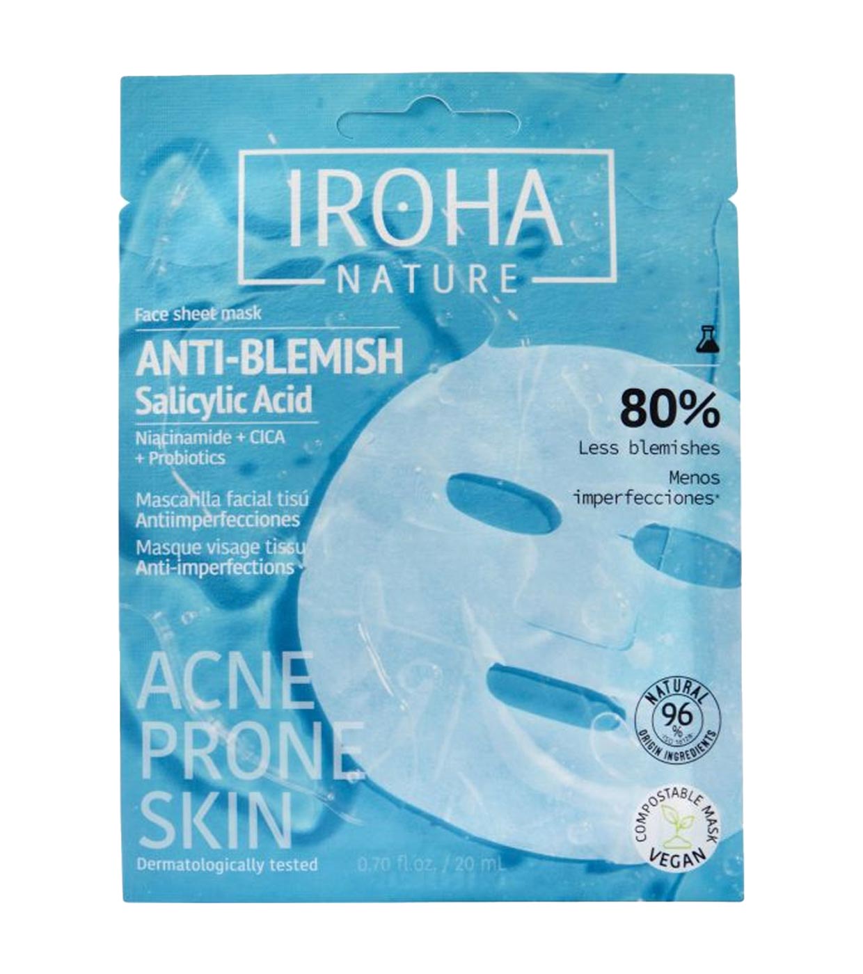 Mascarilla facial de velo anti-imperfecciones con ácido salicílico, niacinamida, CICA y probióticos de Iroha Nature.