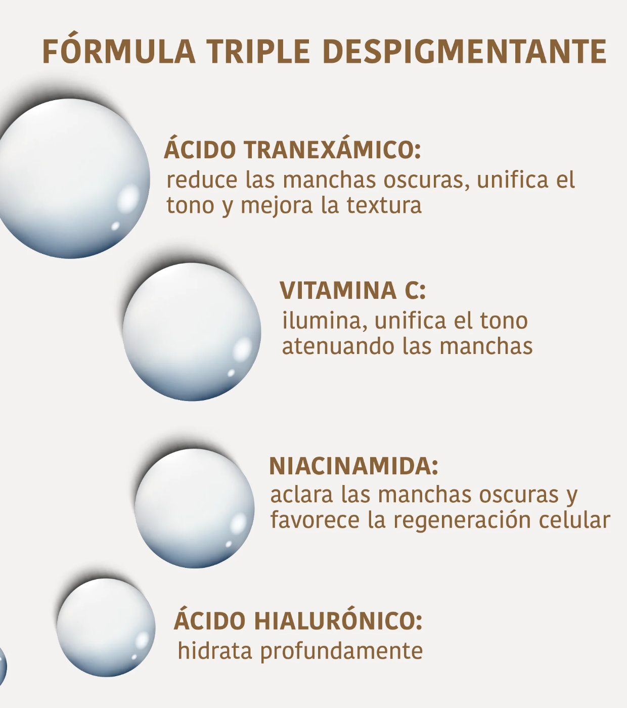 Su combinación de Vitamina C, Niacinamida y Ácido Hialurónico potencia la renovación celular, la hidratación profunda y la mejora de la firmeza y elasticidad, reduciendo también la apariencia de arrugas.