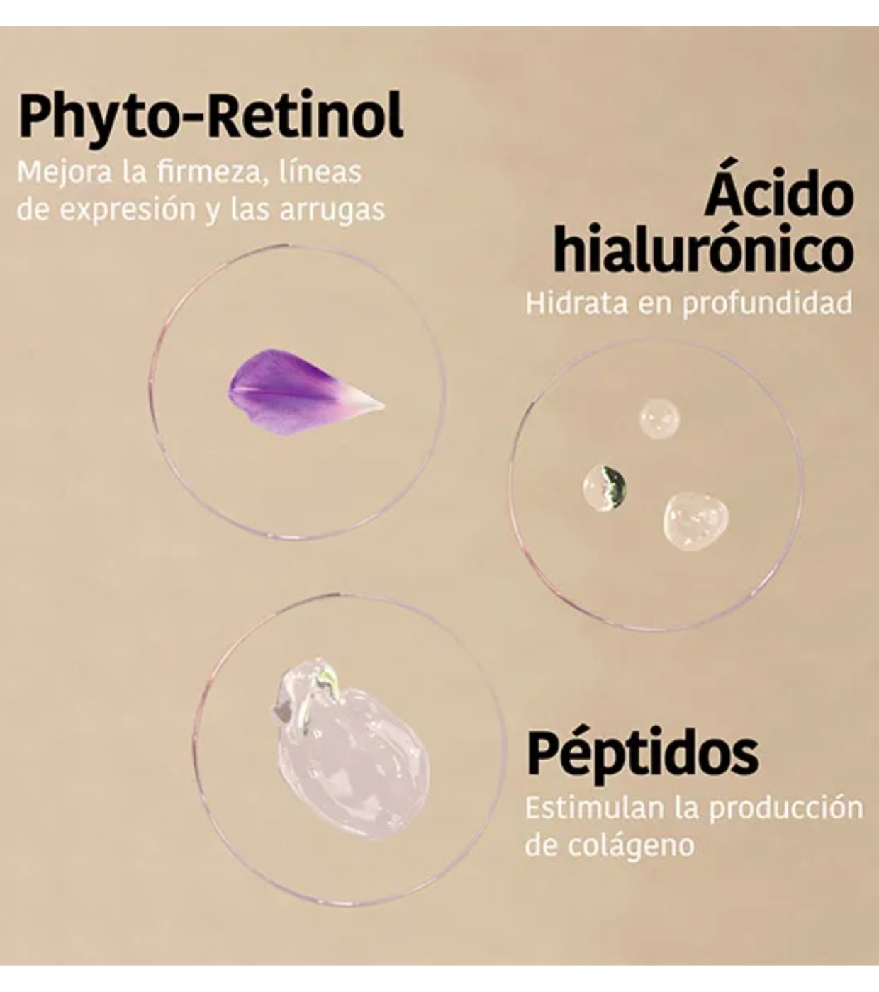 Los ingredientes clave son Bakuchiol, alternativa vegana del retinol que ofrece resultados similares al retinol pero sin los efectos negativos que suelen suponer el uso del retinol.