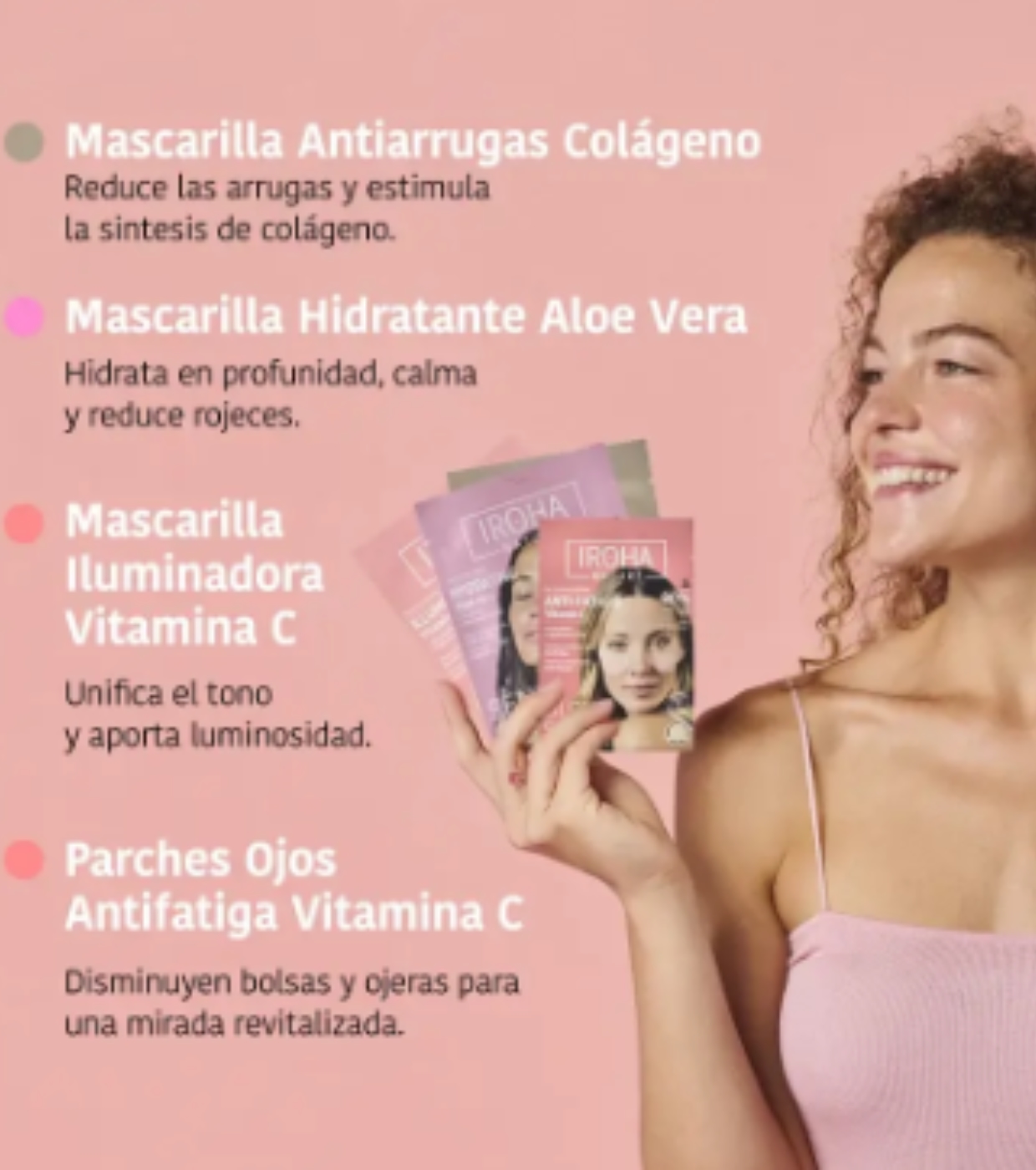 Mascarilla Tisú Antiarrugas Cara y Cuello: Aqua/ Water/ Eau, Glycerin, Propanediol, Butylene Glycol, Collagen Extract, Sodium Hyaluronate, Niacinamide, Hydroxyethylcellulose, Arginine, Allantoin, Trehalose, Disodium EDTA, Dipropylene Glycol, Polyglyceryl-10 Laurate, Polyglyceryl-10 Myristate, Dipotassium Glycyrrhizate, Glyceryl Acrylate/Acrylic Acid Copolymer, PVM/MA Copolymer, Carbomer, Chlorphenesin, Hydroxyacetophenone, 1,2-Hexanediol, Parfum/ Fragrance. Mascarilla Tisú Hidratante: Aqua/ Water, Glycerin, Propanediol, Butylene Glycol, Aloe Barbadensis Leaf Extract, Lactobacillus Ferment, Sodium Hyaluronate, Allantoin, Arginine, Trehalose, Hydroxyethylcellulose, Disodium EDTA, Polyglyceryl-10 Laurate, Polyglyceryl-10 Myristate, Dipotassium Glycyrrhizate, Hydroxyacetophenone, Carbomer, Glyceryl Acrylate/Acrylic Acid Copolymer, PVM/MA Copolymer, Chlorphenesin, 1,2-Hexanediol, Parfum/ Fragrance. Mascarilla Tisú Iluminadora: Aqua/ Water, Glycerin, Propanediol, Butylene Glycol, Niacinamide, Ascorbic Acid, Biosaccharide Gum-4, Sodium Hyaluronate, Allantoin, Arginine, Trehalose, Carbomer, Chlorphenesin, Disodium EDTA, Polyglyceryl-10 Laurate, Polyglyceryl-10 Myristate, Dipotassium Glycyrrhizate, Glyceryl Acrylate/Acrylic Acid Copolymer, PVM/MA Copolymer, Hydroxyacetophenone, Hydroxyethylcellulose, 1,2-Hexanediol, Parfum/ Fragrance. Parches Ojos Anti-Fatiga: Aqua / Water /Eau, Hippophae Rhamnoides Water, Butylene Glycol, Arginine, 1,2-Hexanediol, Citric Acid, Gluconolactone, Centella Asiatica Extract, Hamamelis Virginiana Leaf Extract, Chamaecyparis Obtusa Leaf Extract, Melaleuca Alternifolia Extract, Vaccinium Angustifolium Fruit Extract, Propanediol, Polyglyceryl-10 Laurate, Panthenol, Allantoin, Xanthan Gum, Menthyl Lactate, Parfum /Fragrance.