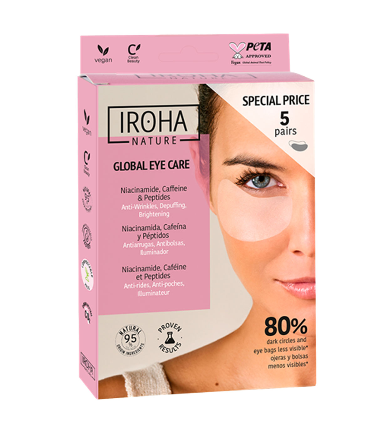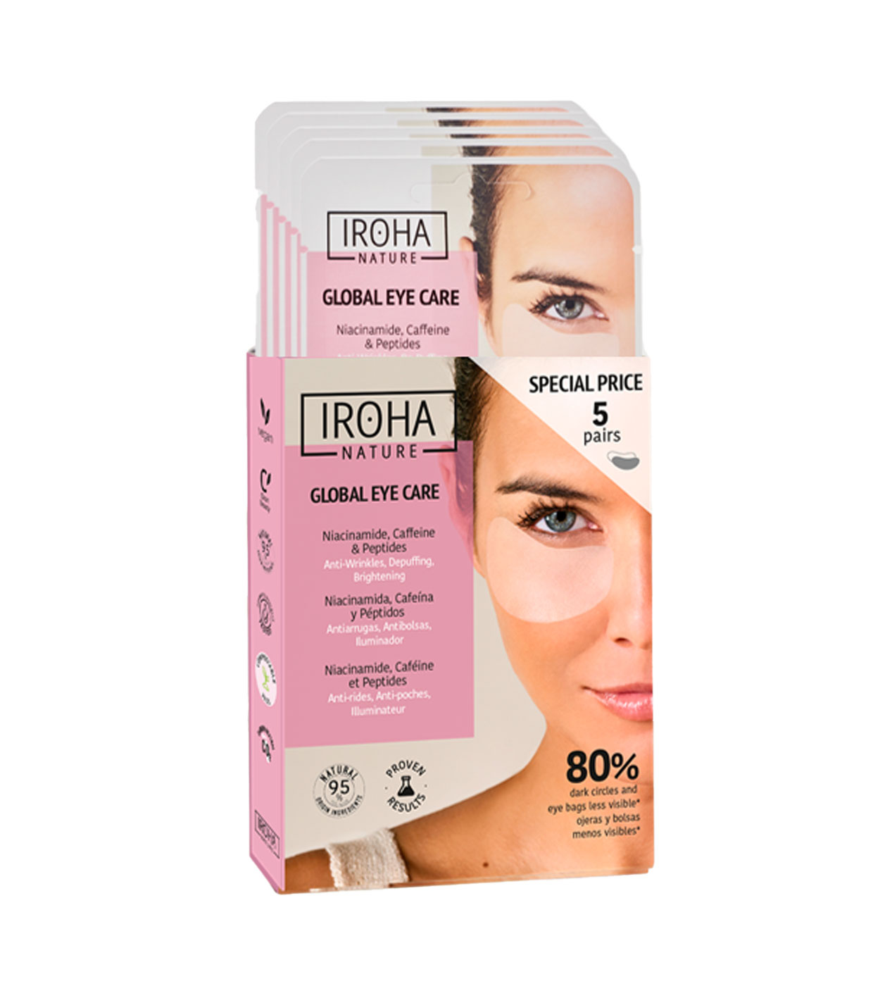Los parches Global Eye Care están diseñados para rejuvenecer el contorno de los ojos gracias a su potente cóctel de ingredientes activos que mejora la apariencia de los signos de la edad (líneas de expresión, arrugas), bolsas, ojeras y falta de hidratación.