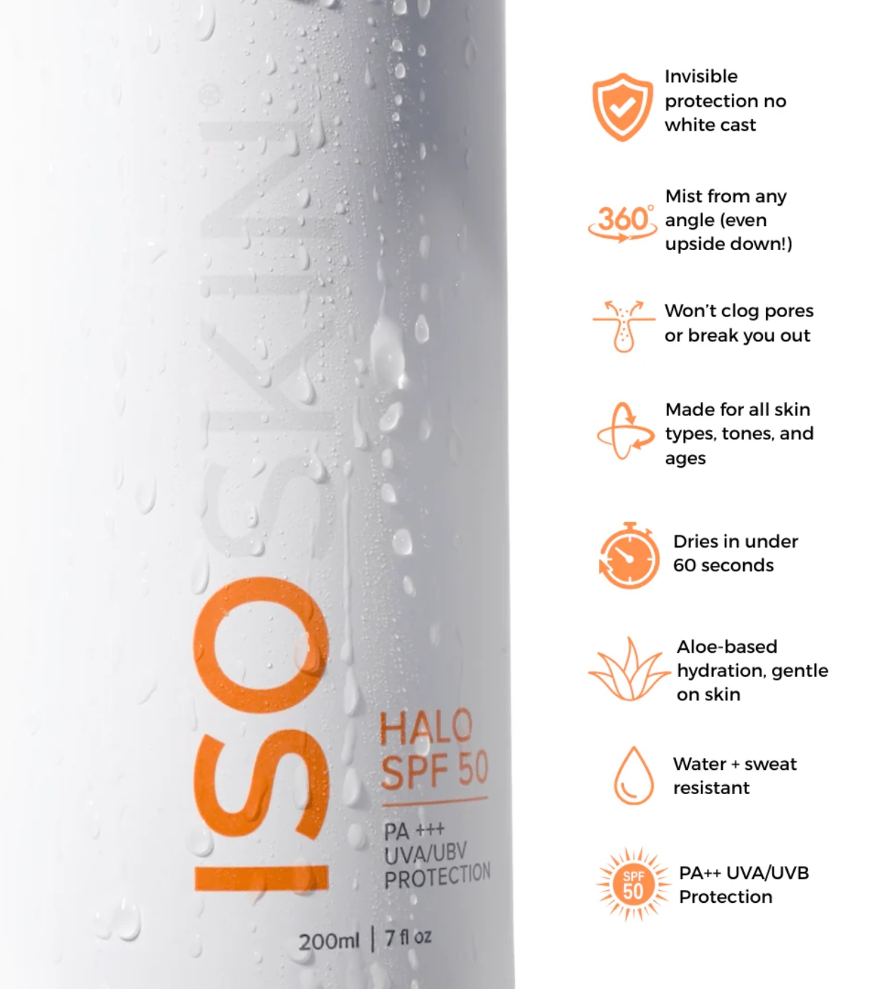Protege tu piel con el ISOSKIN Halo FPS 50, un aerosol solar ligero y de secado rápido que ofrece una defensa eficaz contra los rayos UVA/UVB gracias a su fórmula avanzada con PA+++.