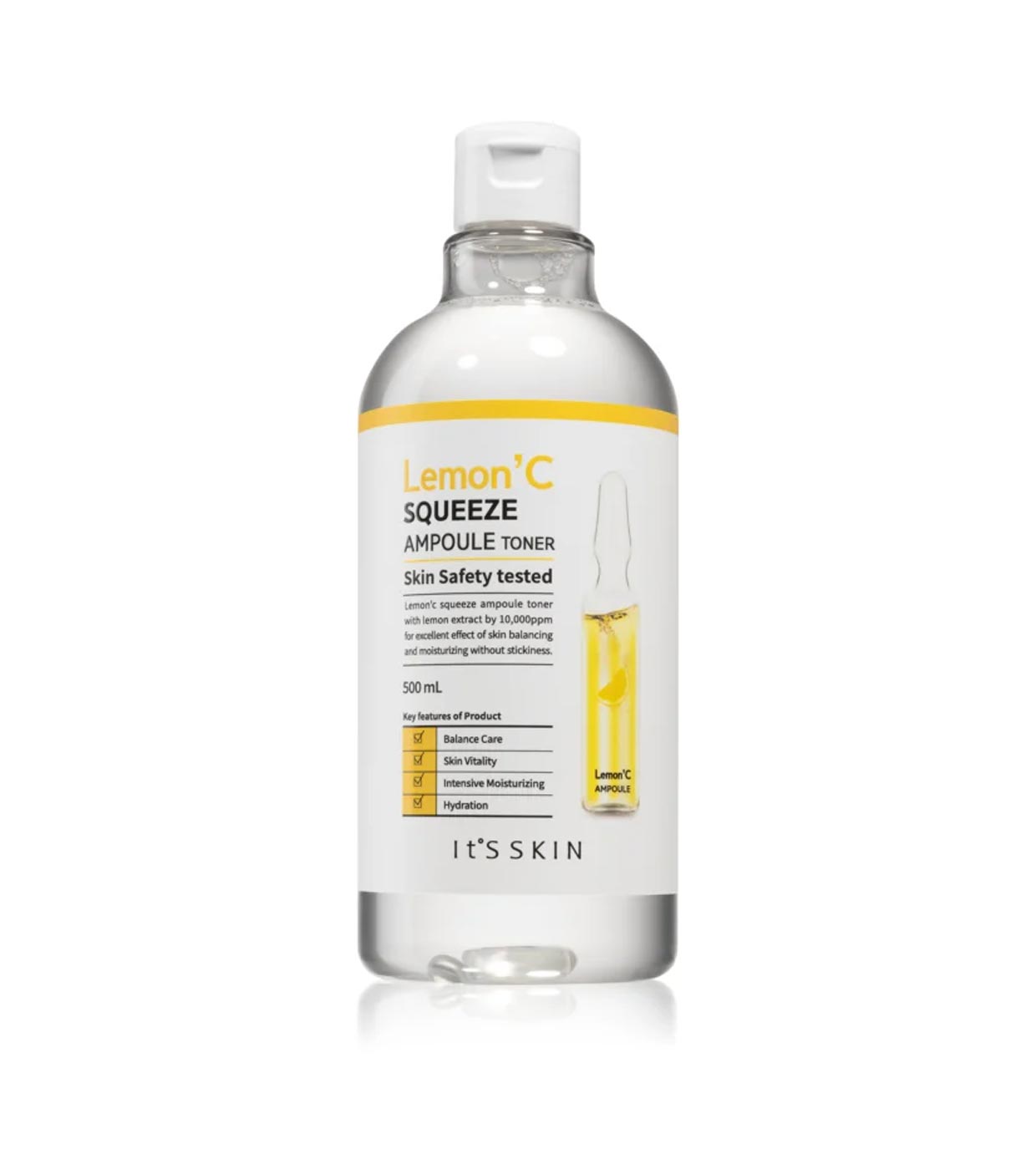 El Tónico de It´s Skin Lemon C de consistencia acuosa con extracto de limón y una mezcla de 8 tipos de ácido hialurónico, contribuye a la luminosidad facial y a la reducción de manchas oscuras.