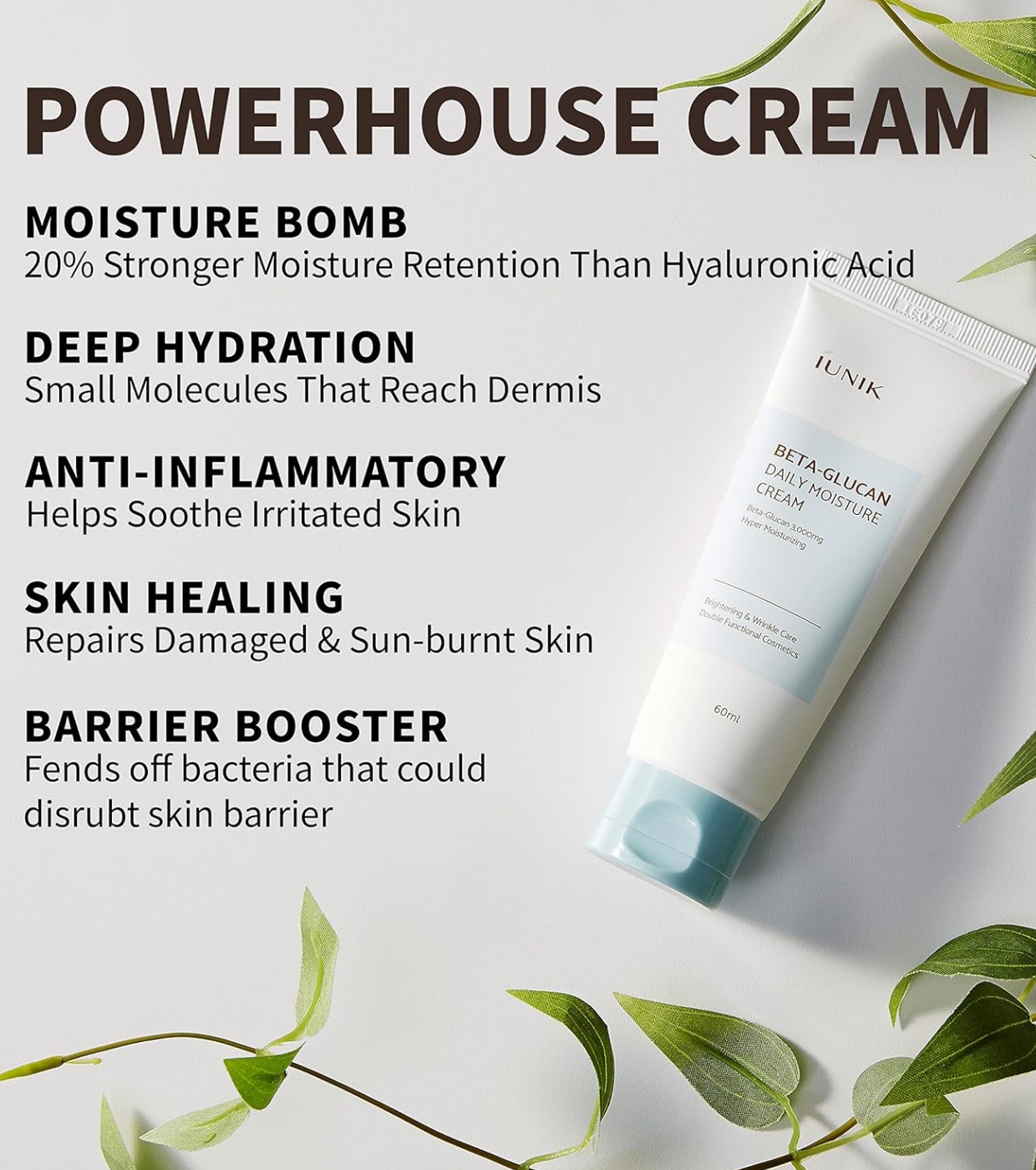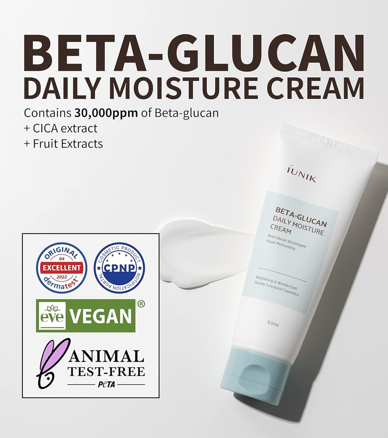 Esta crema facial Beta-Glucan de iUNIK es ultrahidratante está formulada para cuidar la piel sensible, seca o con signos visibles de la edad.