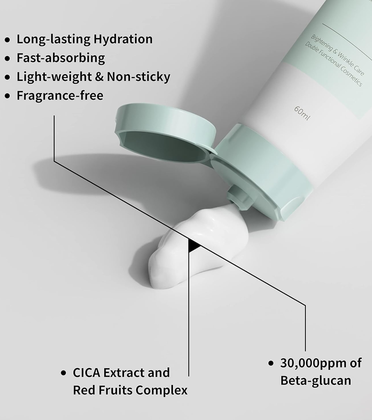 Water, Butylene Glycol, Glycerin, Methyl Trimethicone, Centella Asiatica Extract, Beta-Glucan, Cetearyl Alcohol, 1,2-Hexanediol, Niacinamide, Hydrogenated Polyisobutene, Isononyl Isononanoate, Cetearyl Glucoside, Glyceryl Stearate, Sorbitan Stearate, Cetearyl Olivate, Sorbitan Olivate, Acrylates/C10-30 Alkyl Acrylate Crosspolymer, Betaine, Allantoin, Adenosine, Dipotassium Glycyrrhizate, Glucose, Sodium Hyaluronate, Arginine, Prunus Salicina Fruit Extract, Punica Granatum Fruit Extract, Rubus Idaeus (Raspberry) Fruit Extract, Fragaria Vesca (Strawberry) Fruit Extract, Prunus Persica (Peach) Fruit Extract