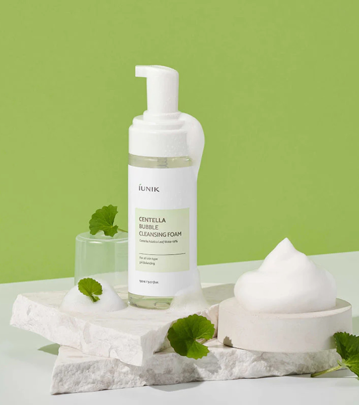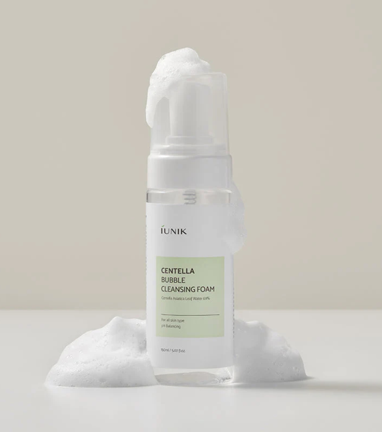 Esta espuma limpiadora Bubble Cleansing Foam de iUNIK está formulado con un 69% de extracto de centella asiática y agua de hoja de árbol de té, proporcionando una limpieza eficaz sin resecar la piel.