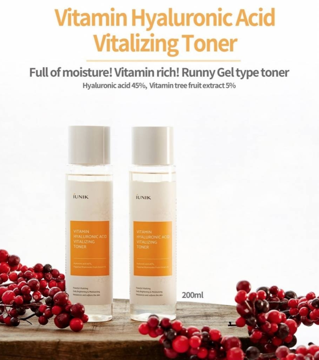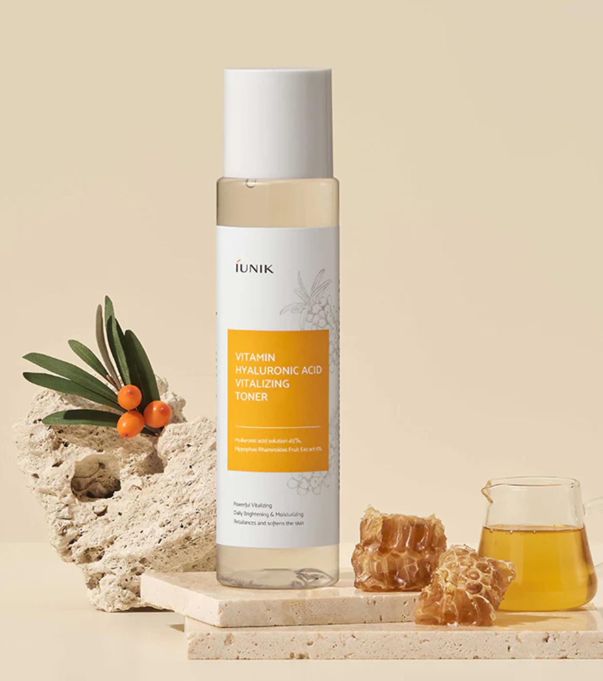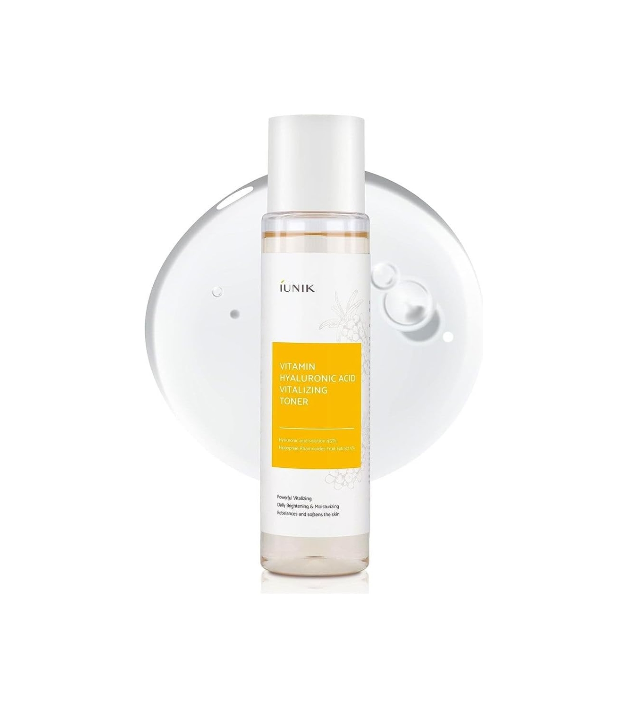 Este tónico en gel lÃquido de iUNIK ofrece un cuidado hidratante e iluminador intensivo gracias a su fórmula de alta eficacia con 45 % de ácido hialurónico y 5 % de extracto de fruto de Hippophae rhamnoides.