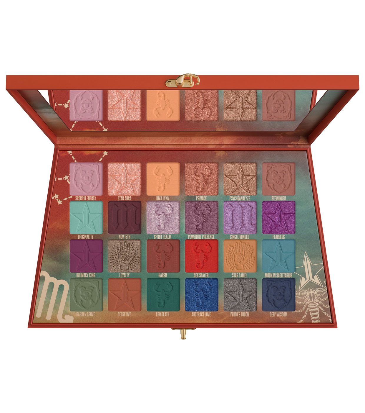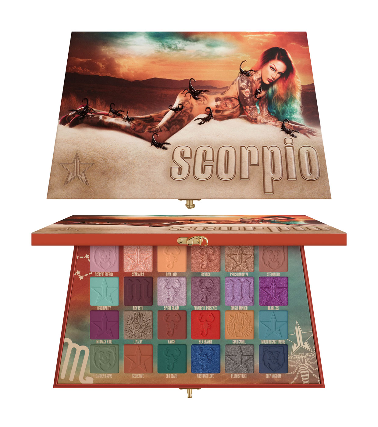 Sumérgete en las profundidades del signo zodiacal de Jeffree con esta paleta de sombras de 24 tonos diseñada para captar plenamente la energía de Escorpio.