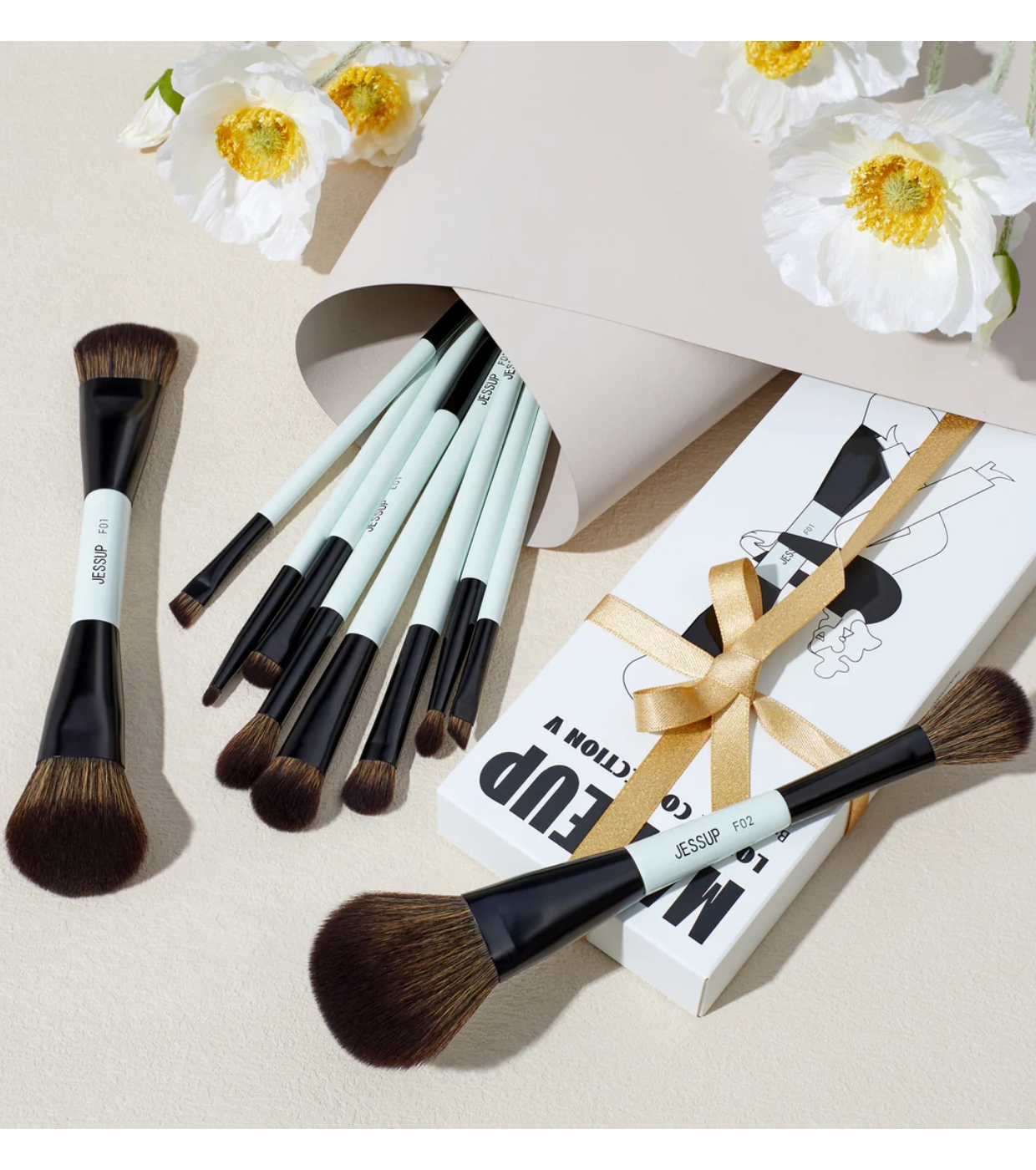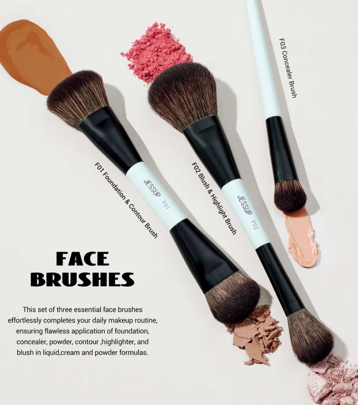 - F02 Brocha doble para colorete e iluminador: Suaves cerdas esponjosas para una aplicación impecable de colorete e iluminador.