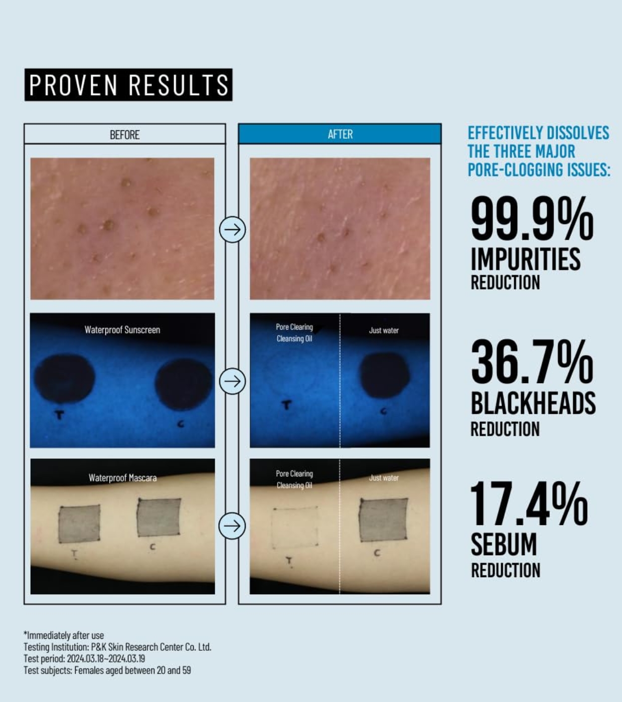 Disuelve eficazmente los principales problemas que obstruyen los poros, como impurezas, puntos negros y sebo, al mismo tiempo que elimina eficazmente el protector solar resistente al agua y el rímel, todo a la vez.