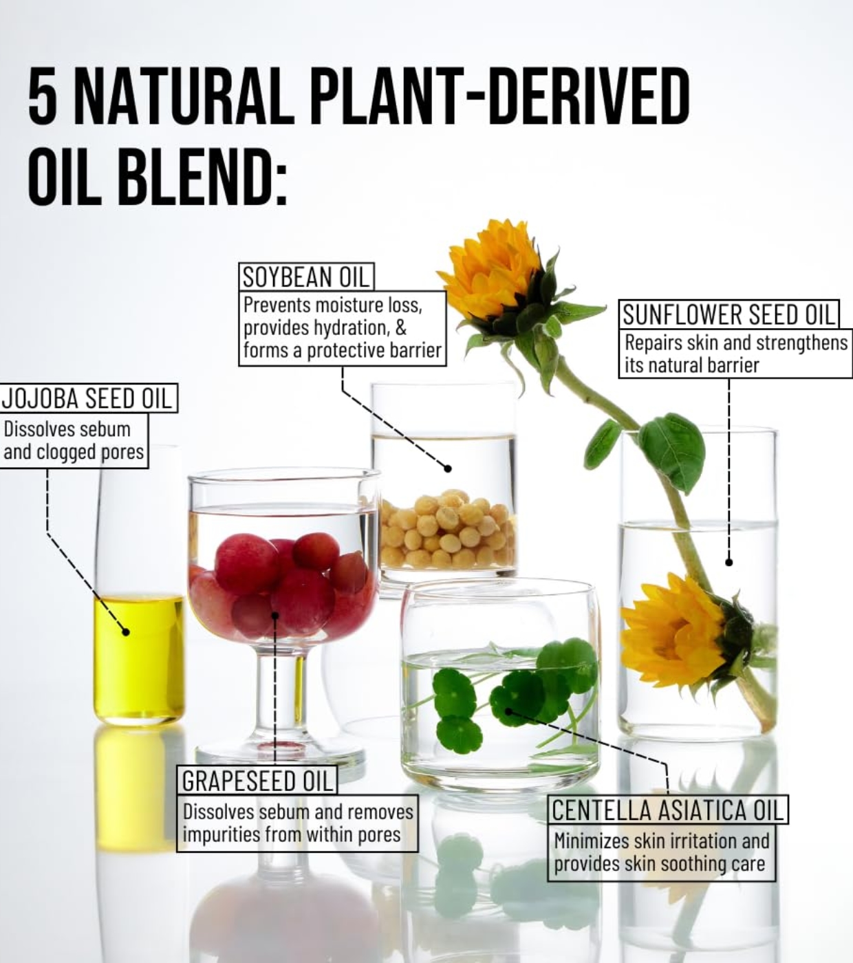 Ethylhexyl Palmitate, Sorbeth-30 Tetraoleate, Helianthus Annuus (Sunflower) Seed Oil, Caprylic/Capric Triglyceride, Tocopherol, Vitis Vinifera (Grape) Seed Oil, Squalane, Simmondsia Chinensis (Jojoba) Seed Oil, Macadamia Ternifolia Seed Oil, Adansonia Digitata Seed Oil, Citrus Aurantium Bergamia (Bergamot) Fruit Oil, Centella Asiatica Oil, Citrus Limon (Lemon) Peel Oil, Glycine Soja (Soybean) Oil