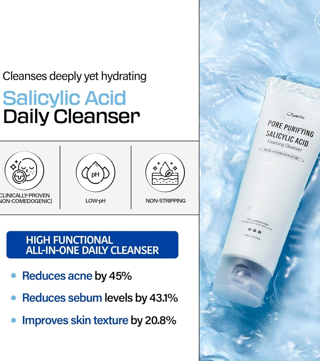 El Pore-Purifying Salicylic Acid Foaming Cleanser de Jumiso es un limpiador de bajo pH que exfolia suavemente e hidrata la piel con ácido salicílico y extracto de manzana para un cutis más suave.
