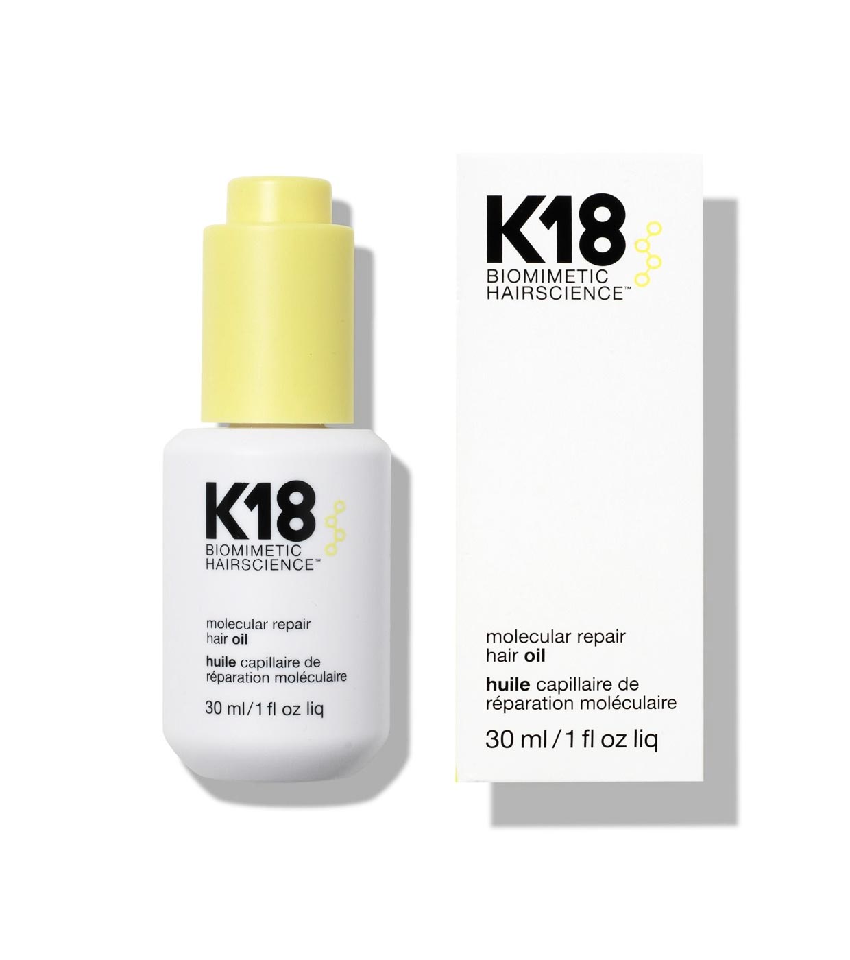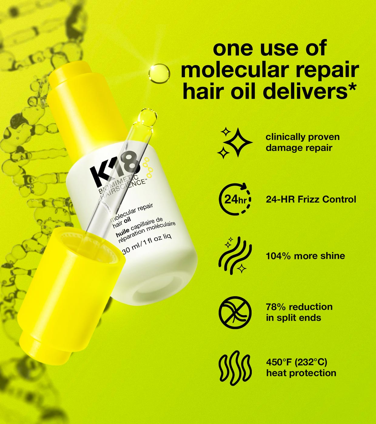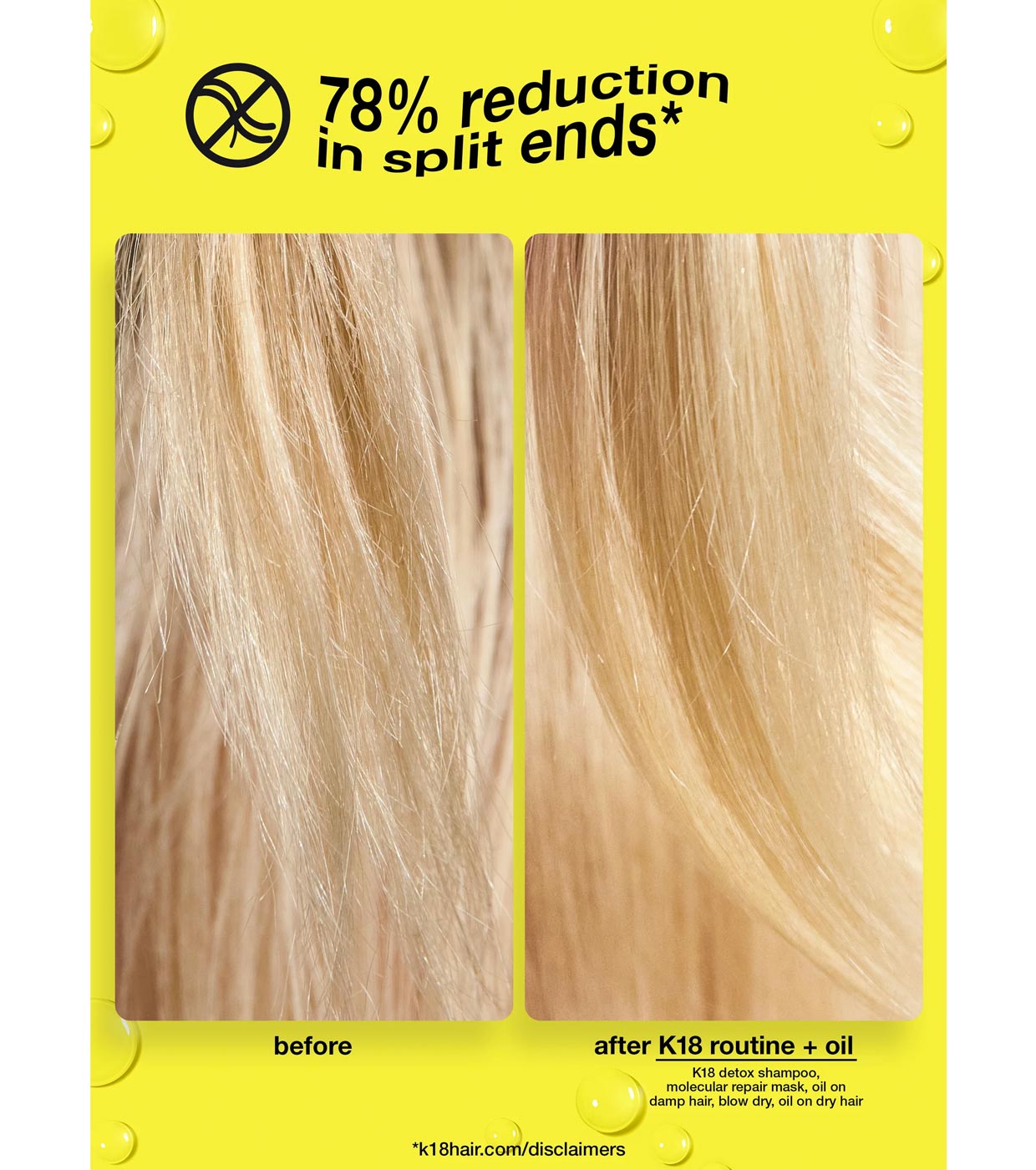 Consejo profesional - Si utiliza la mascarilla de reparación molecular K18, aplique primero la mascarilla sobre el cabello limpio y húmedo, y espere 4 minutos. Aplique el aceite capilar de reparación molecular y espere 4 minutos para obtener los máximos resultados de fortalecimiento.