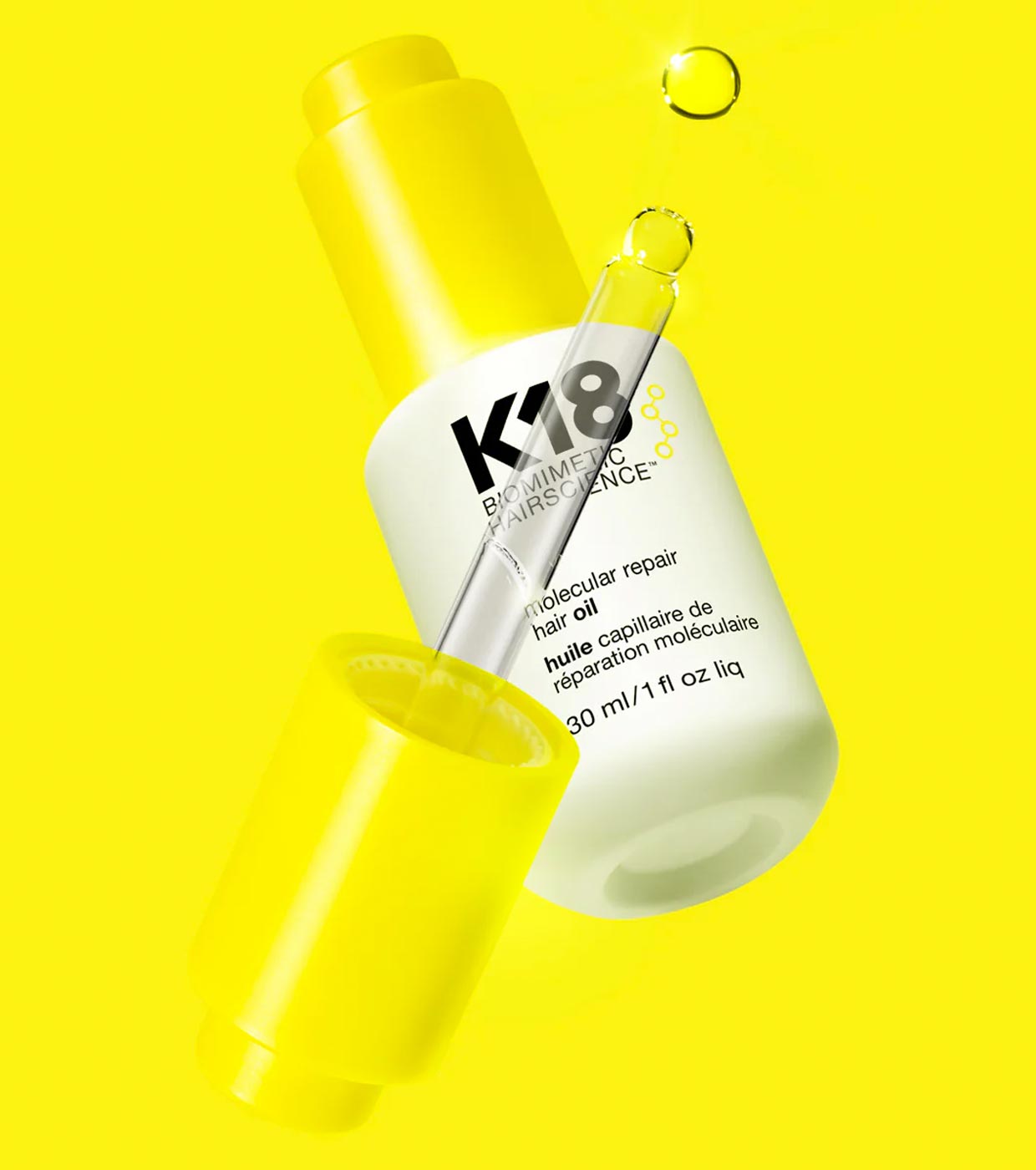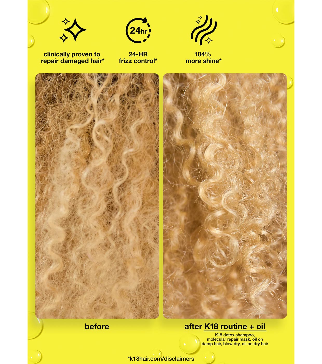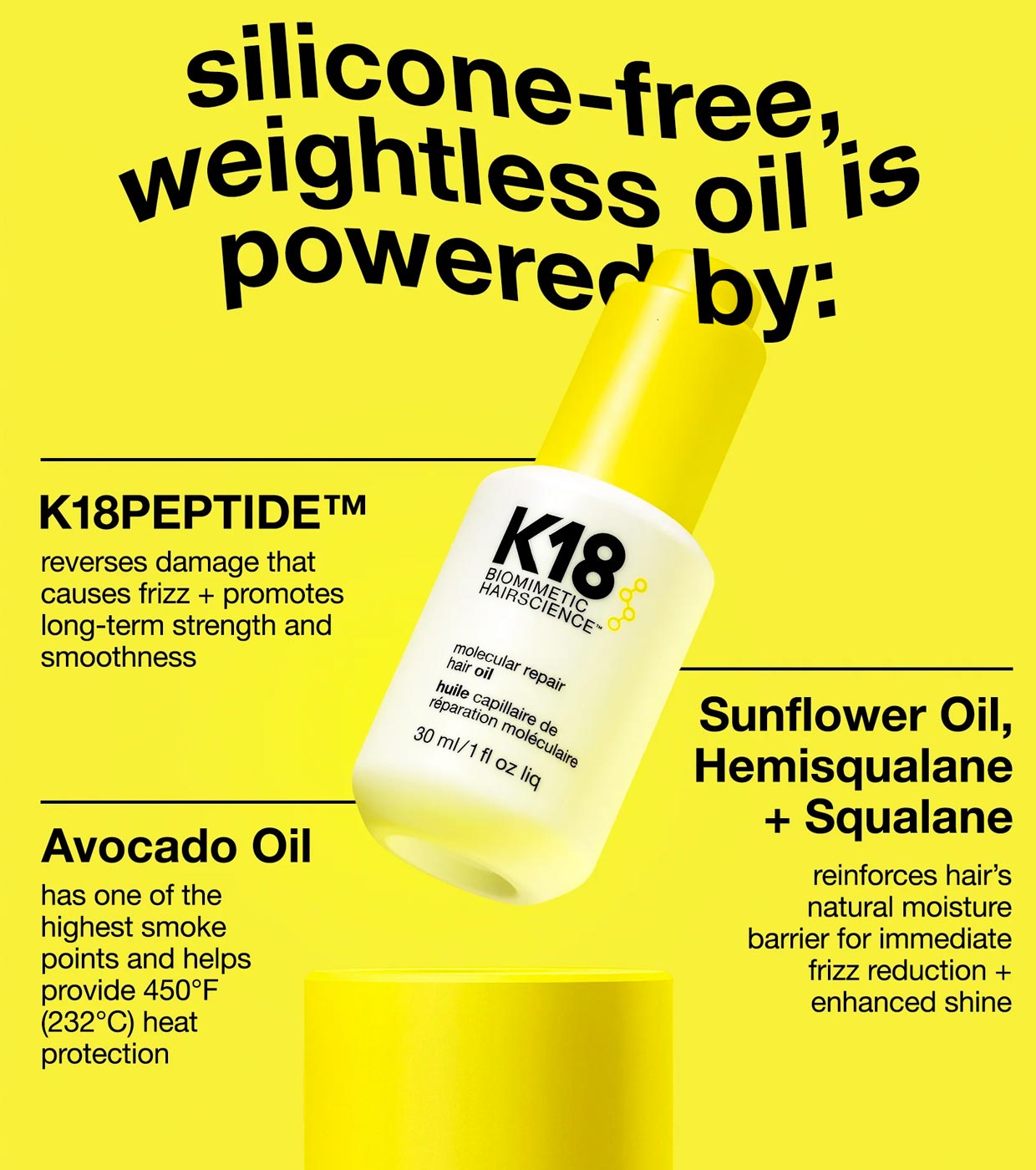 Consejo profesional - Si utiliza la mascarilla de reparación molecular K18, aplique primero la mascarilla sobre el cabello limpio y húmedo, y espere 4 minutos. Aplique el aceite capilar de reparación molecular y espere 4 minutos para obtener los máximos resultados de fortalecimiento.