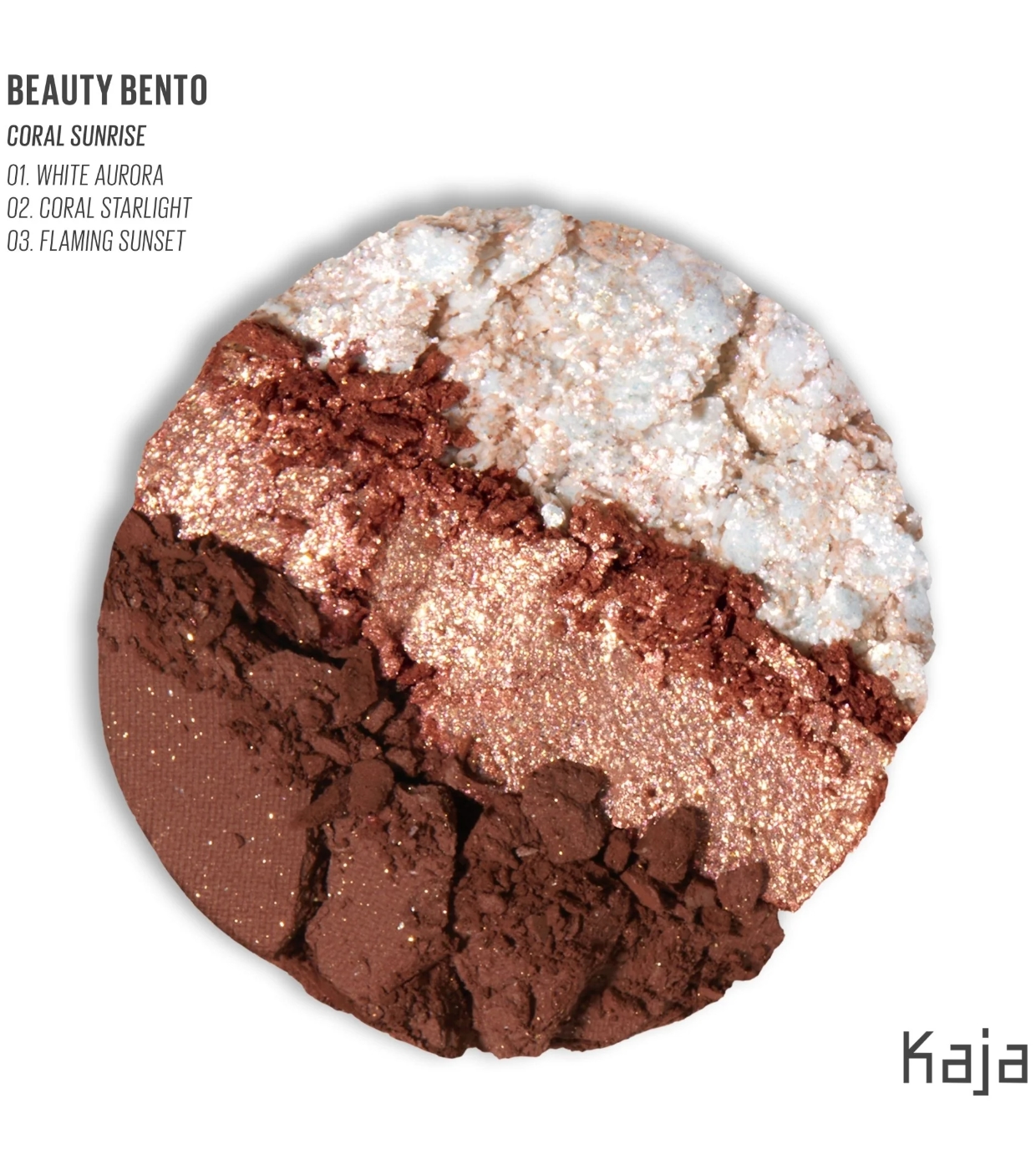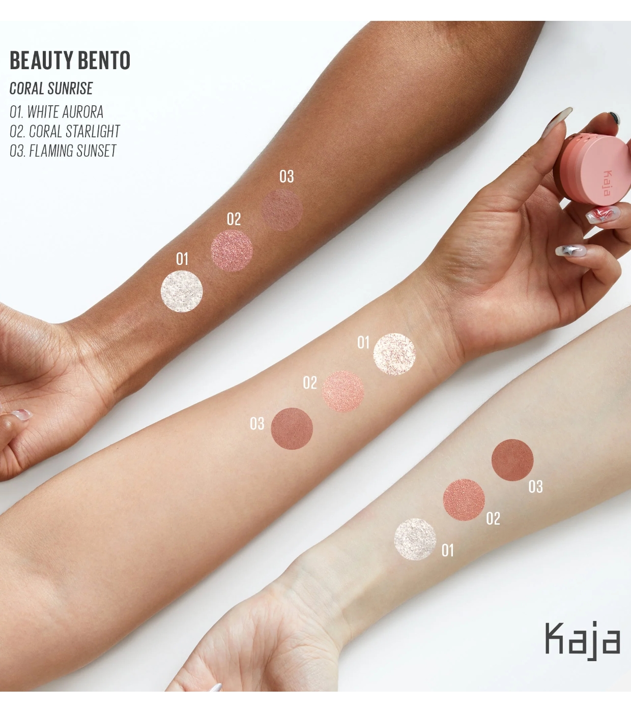 Las sombra de ojos 3 en 1 Beauty Bento de Kaja es un trío de sombras de ojos en polvo cremosas que combinan textura sedosa y alta pigmentación, permitiéndote crear looks naturales o llamativos con un solo producto.