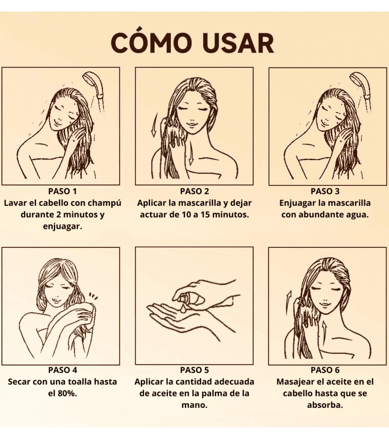 Cabello: Masajear unas gotas durante 3 minutos por todo el cabello para obtener un cabello brillante y sedoso.