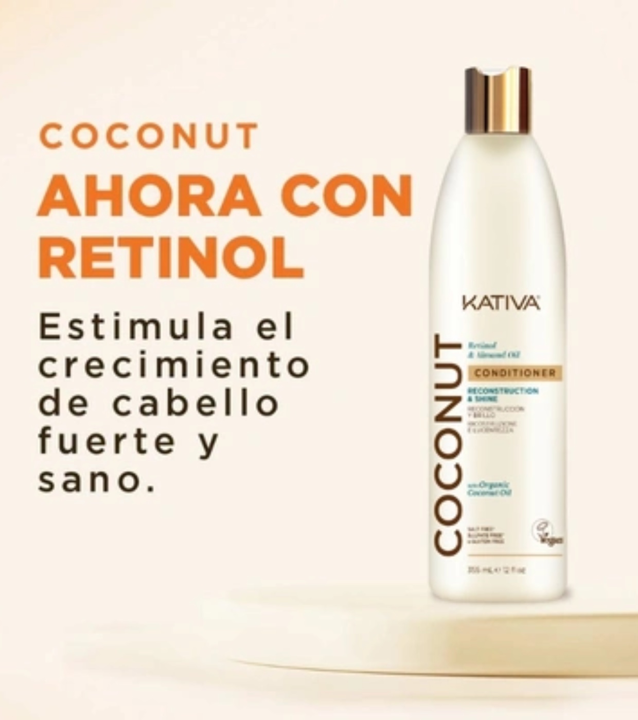 El Coconut acondicionador reconstrucción y brillo de Kativa está especialmente formulado para devolver la vitalidad, la suavidad y el brillo a los cabellos opacos, deshidratados y con daño extremo.