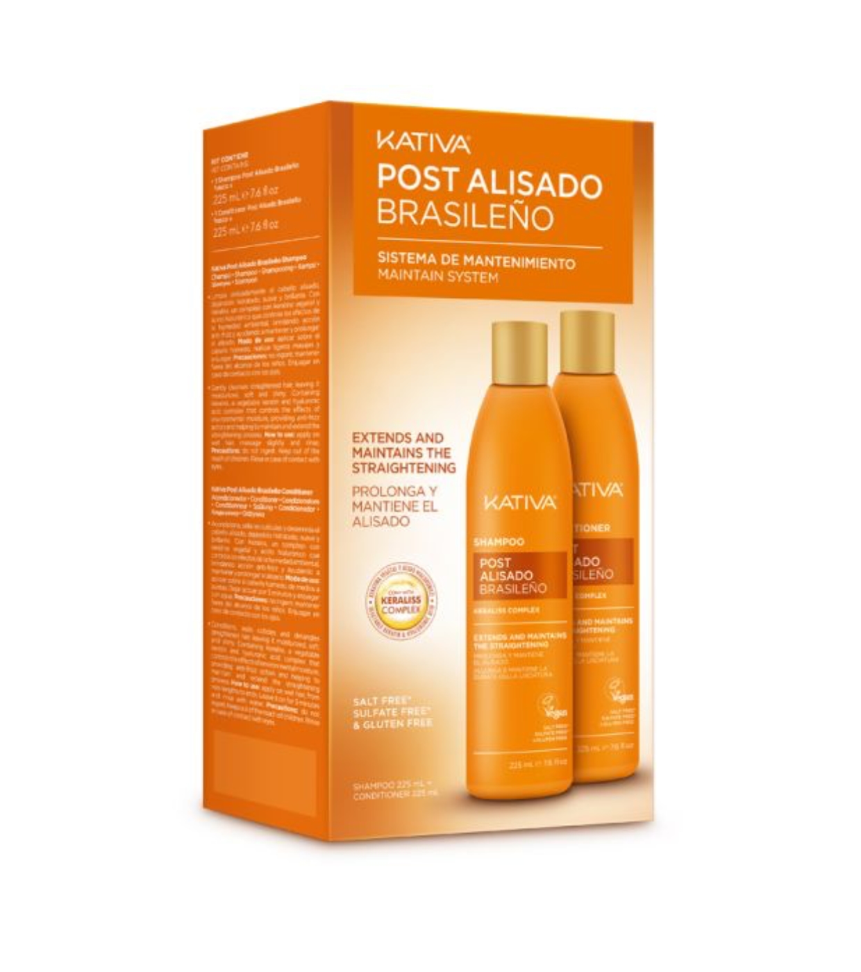 - KATIVA Post Alisado Brasileño Champú (225 ml): Limpia delicadamente sin alterar el alisado; Hidrata y deja el cabello suave y brillante; Prolonga el efecto liso y controla el frizz.