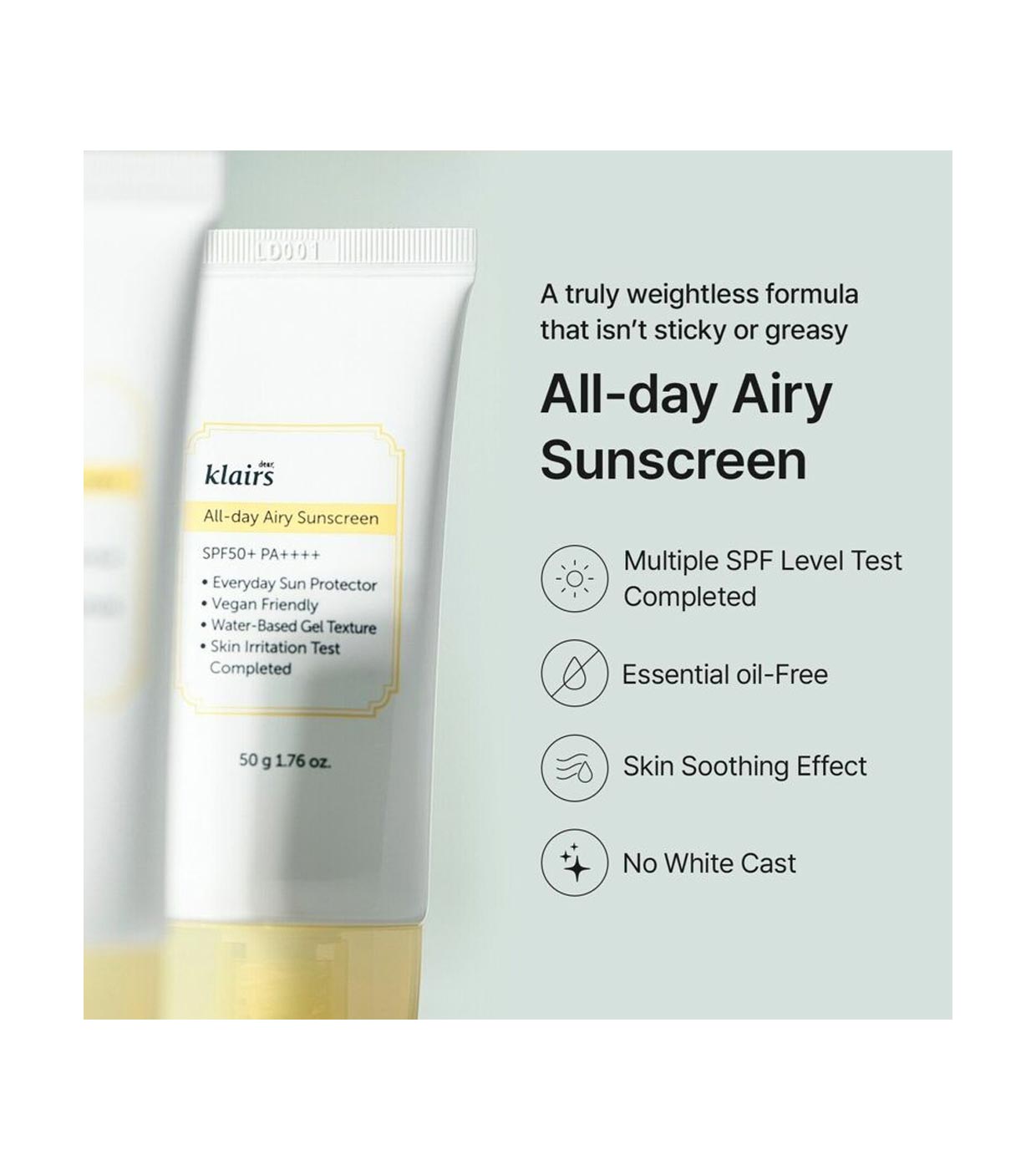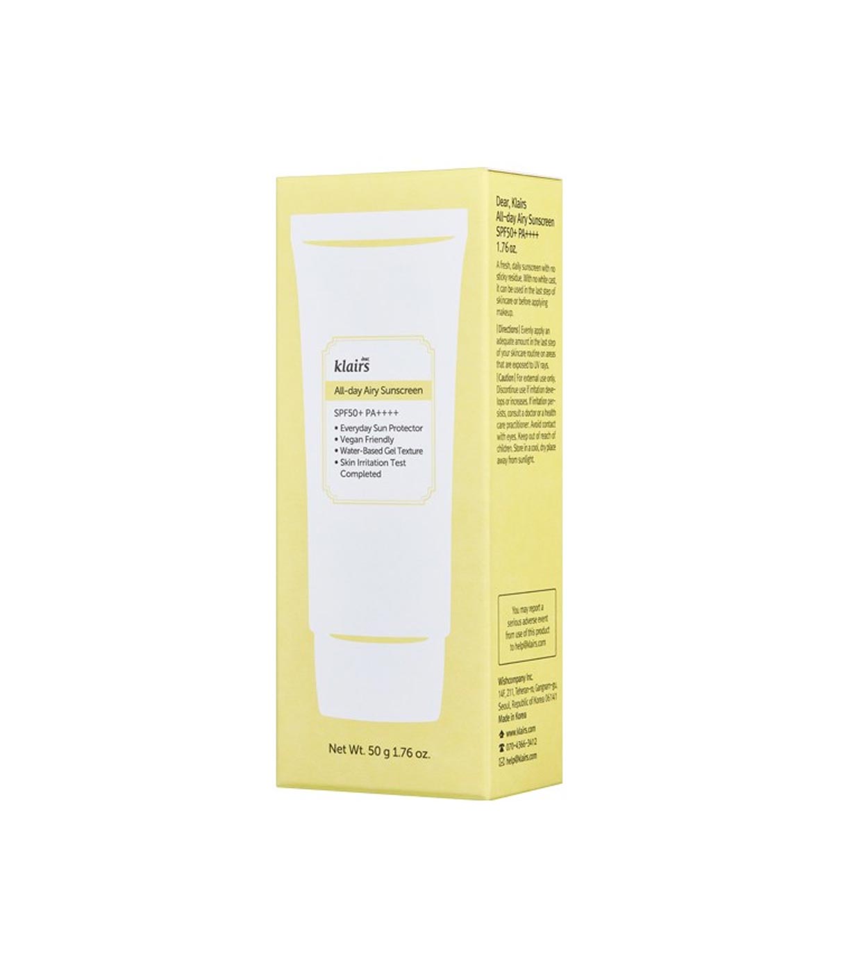 La crema solar All-day Airy Sunscreen SPF50+ PA++++ de Klairs es perfecta para usar a diario, dado que es una crema ligera, fresca y nada pegajosa.