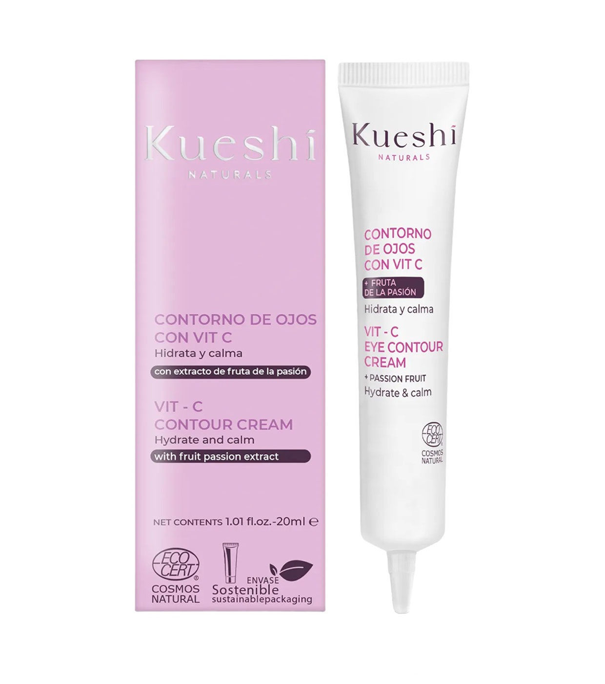 Experimenta una hidratación y calma con el Contorno de Ojos con Vitamina C de Kueshi, una fórmula enriquecida con extracto de avena y caléndula diseñada para pieles sensibles.