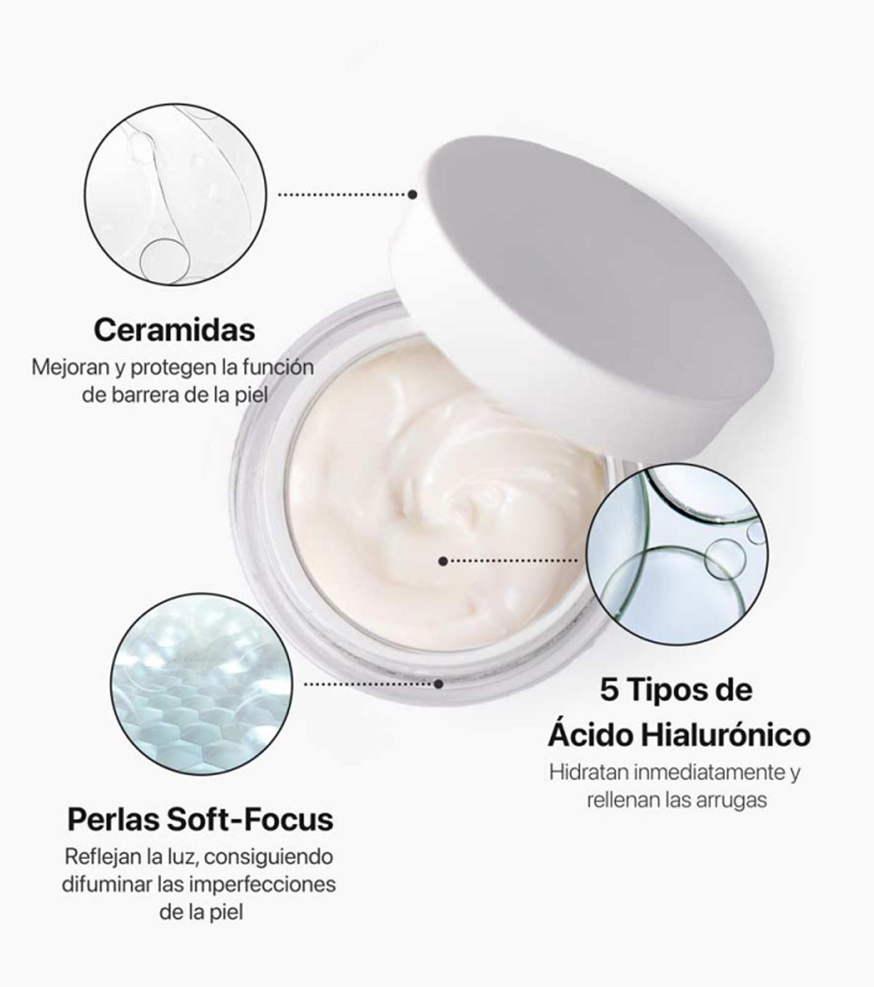 Una fórmula única con cinco tipos de Ácido Hialurónico de diferente peso molecular (alto, medio y bajo), Ceramidas, Escualano, Perlas Soft-Focus y Escudo Antipolución.