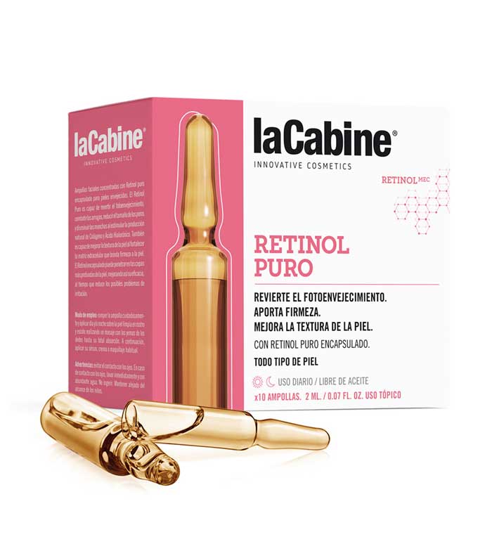 Ampollas faciales concentradas con Retinol Puro encapsulado que revierten el foto-envejecimiento y mejoran la textura de la piel a la vez que mantienen el equilibrio de la matriz extracelular aportando firmeza y estimulando la síntesis de colágeno y Ácido Hialurónico.