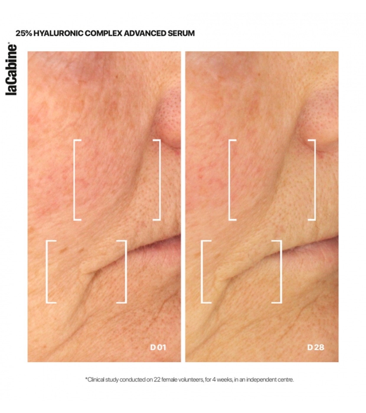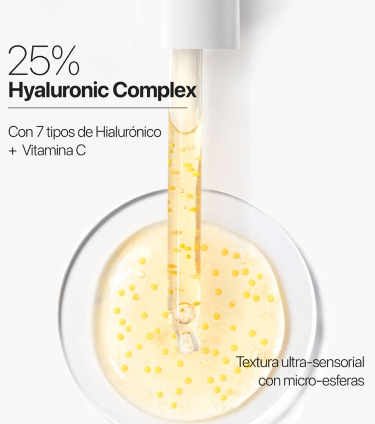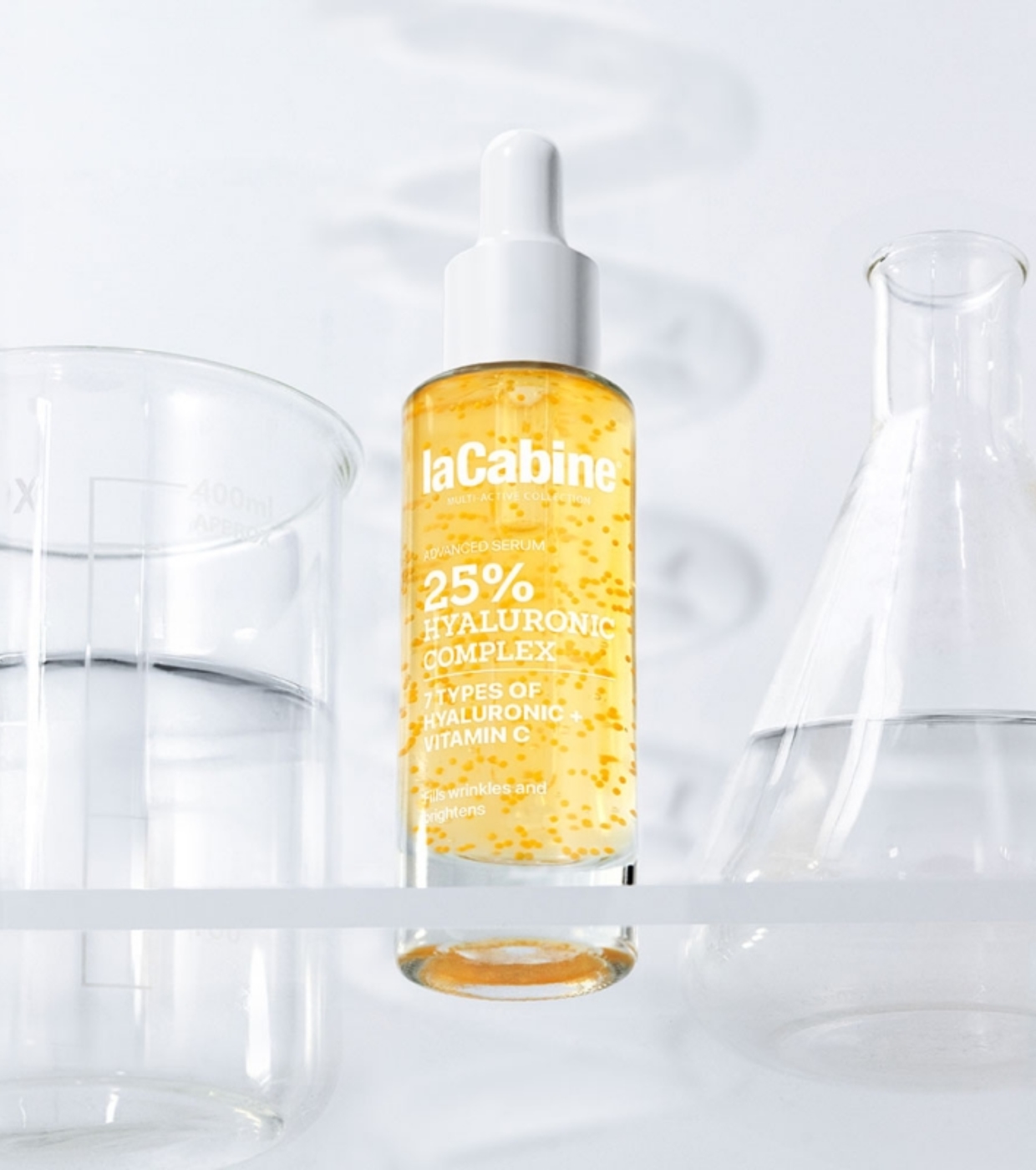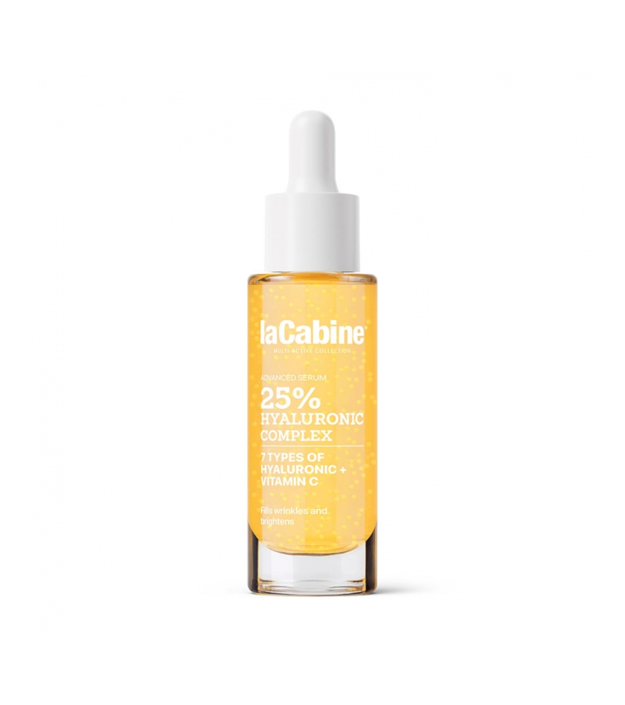 Este sérum avanzado 25% Hyaluronic Complex de La Cabine de última generación combina un complejo al 25% de 7 tipos de Ácido Hialurónico con Vitamina C estabilizada para ofrecer una acción completa: rellena arrugas, hidrata en profundidad e ilumina la piel desde la primera aplicación.