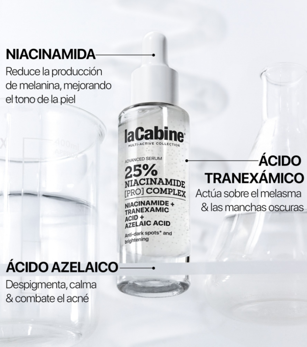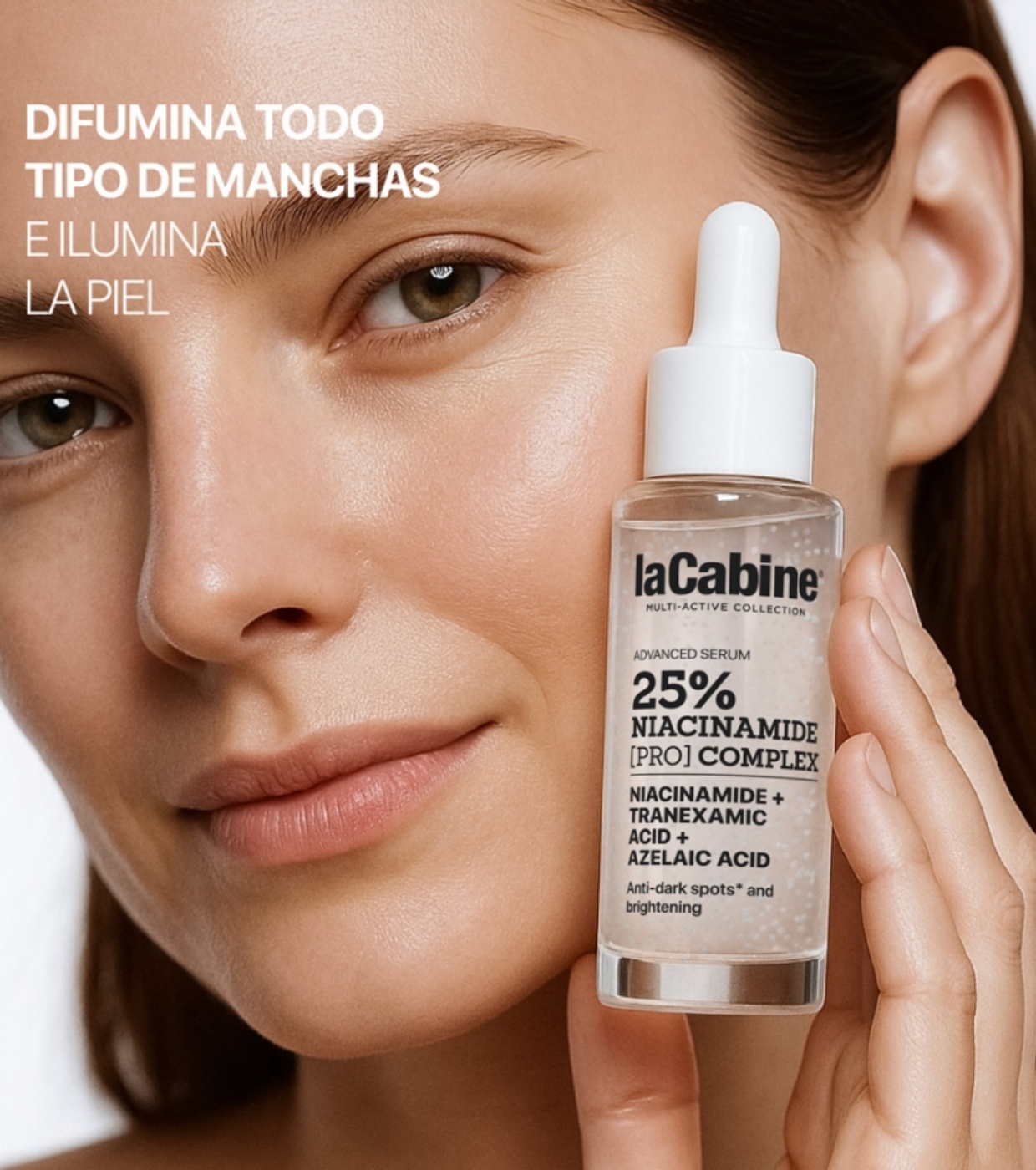 Este sérum avanzado 25% Niacinamide Pro Complex de La Cabine de última generación combina un complejo al 25% de Niacinamida Pro, Ácido Tranexámico y Ácido Azelaico para tratar eficazmente todo tipo de manchas oscuras y revelar una piel más uniforme, luminosa y saludable.