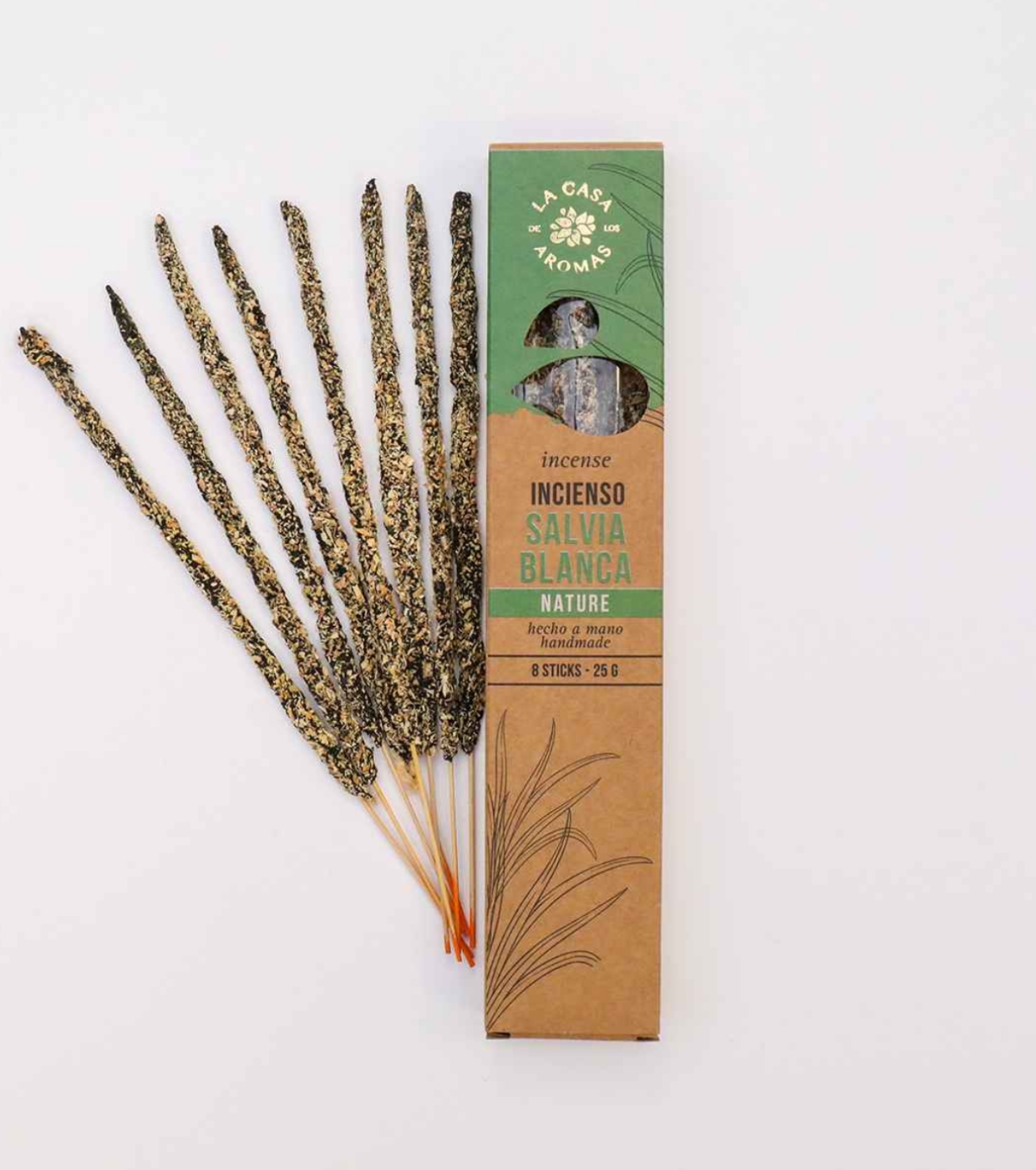 Purifica tu espacio con el incienso en sticks de la salvia blanca de La Casa de los Aromas, una fragancia herbal y terrosa que evoca antiguos rituales de claridad y protección.