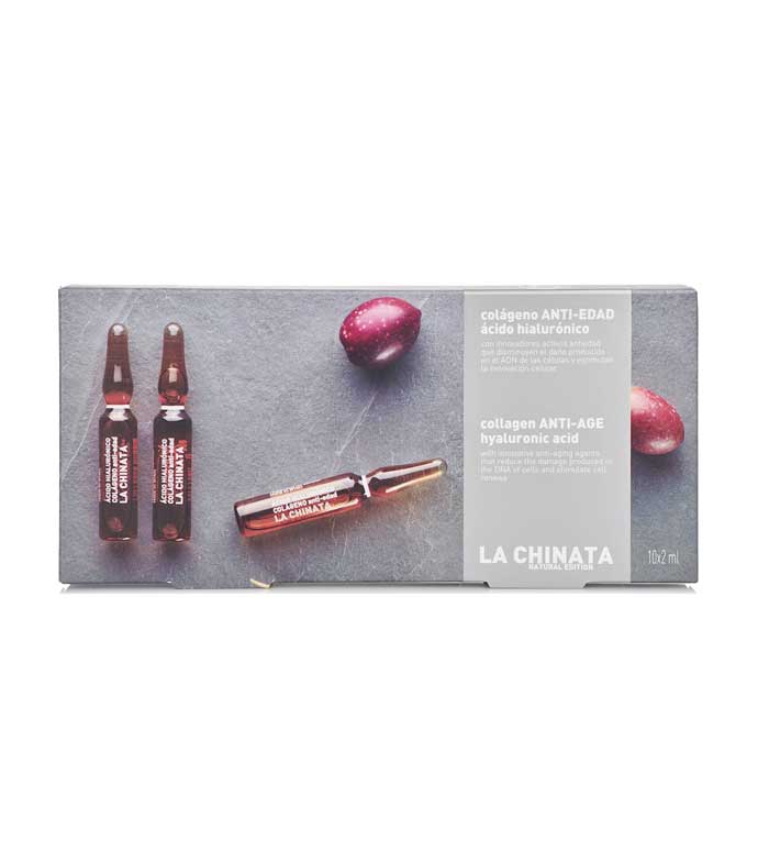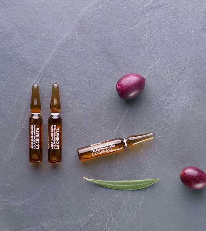 Ampollas antiedad de colágeno y ácido hialurónico de La Chinata, un elixir de juventud con innovadores activos antiedad que disminuyen el daño producido en el ADN de las células y estimulan la renovación celular.