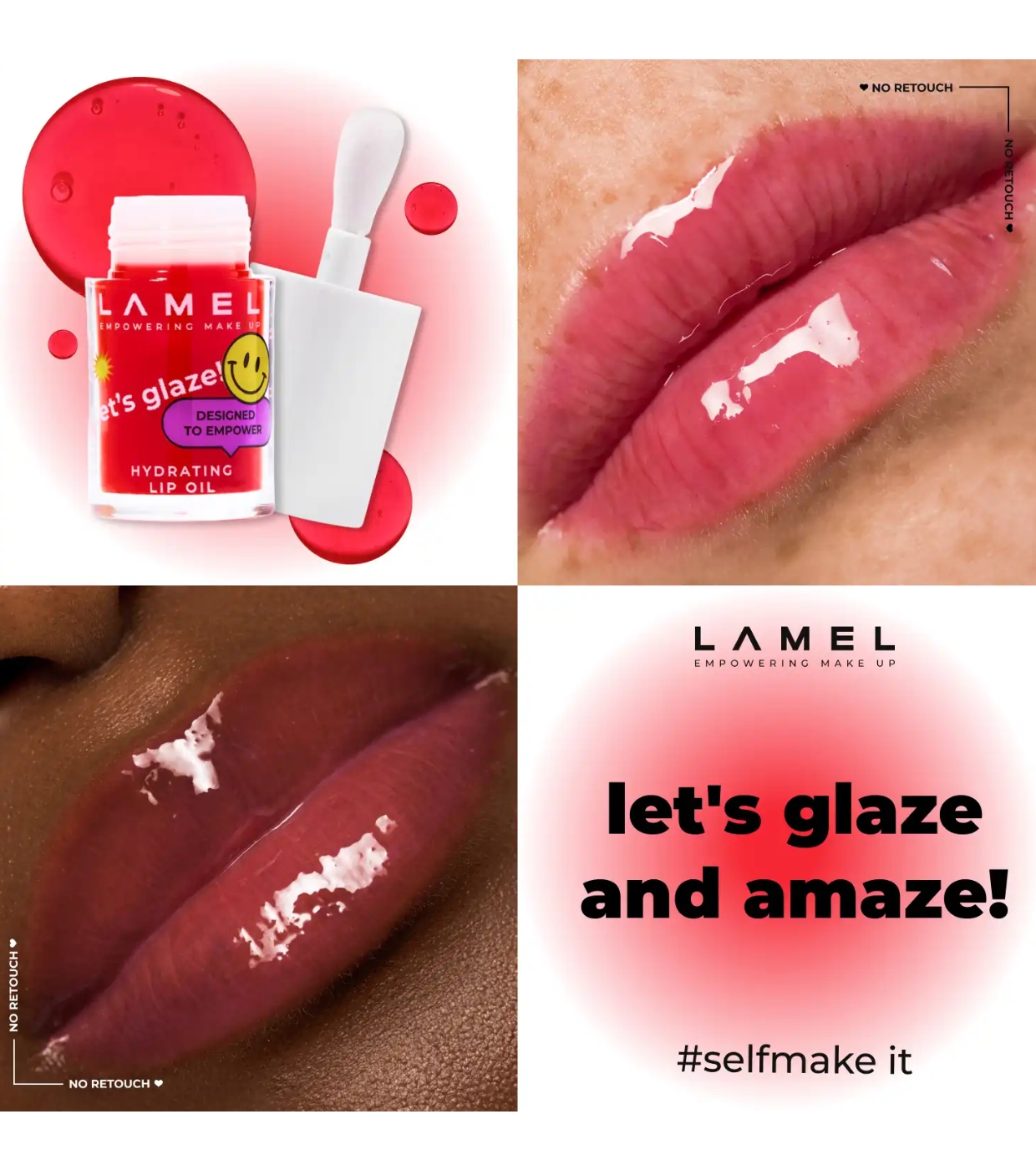 Dale a tus labios un toque irresistible con el aceite labial Let’s Glaze de Lamel, diseñado para aportar hidratación profunda, brillo radiante y un color semitransparente que realza tu belleza natural.