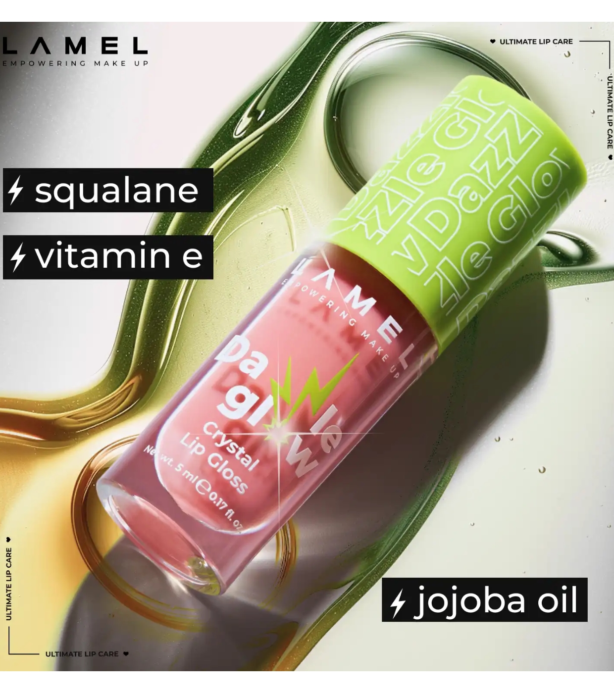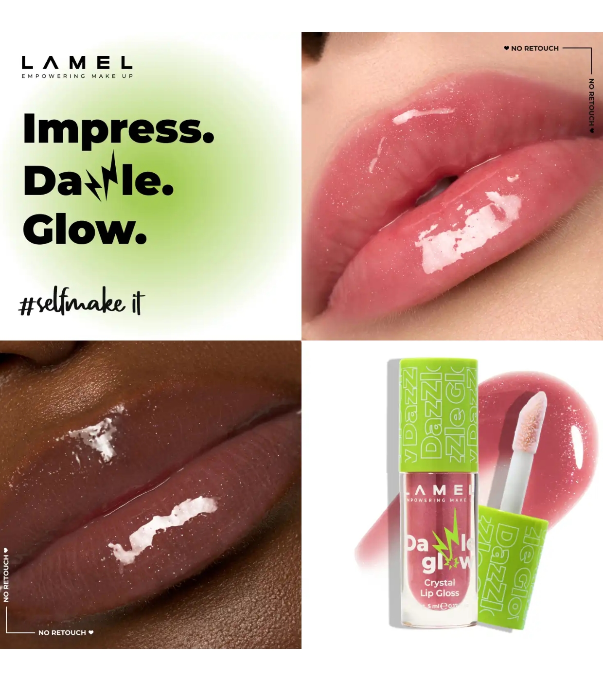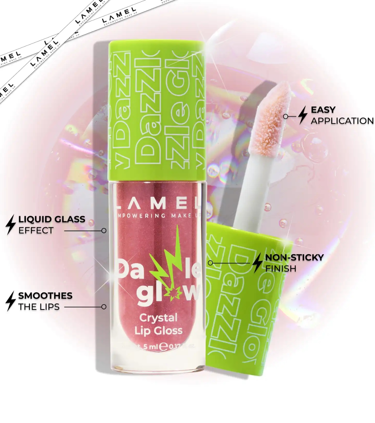 Prepárate para lucir unos labios irresistibles con el Dazzle Glow Crystal Lip Gloss de Lamel, un brillo labial que eleva cualquier look al instante.