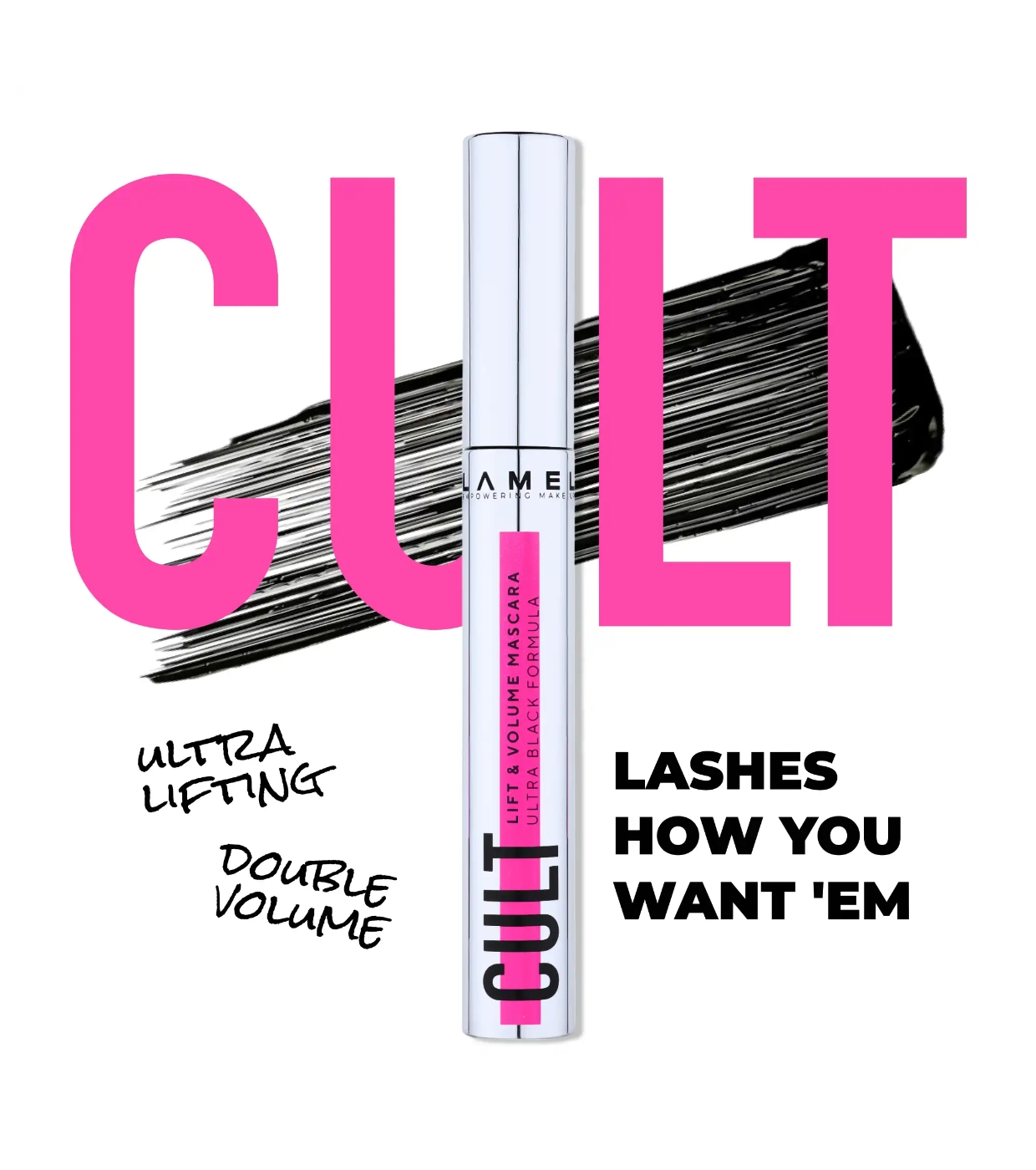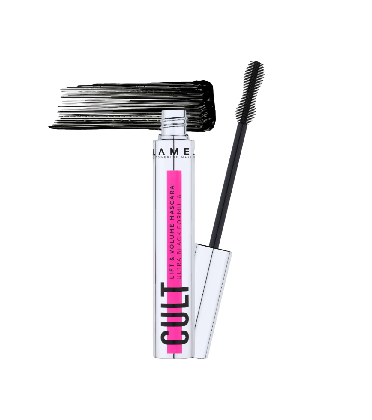 Consigue unas pestañas espectaculares con esta máscara de pestañas Cult de Lamel, diseñada para ofrecer un efecto lifting inmediato y un resultado duradero sin grumos ni caídas.