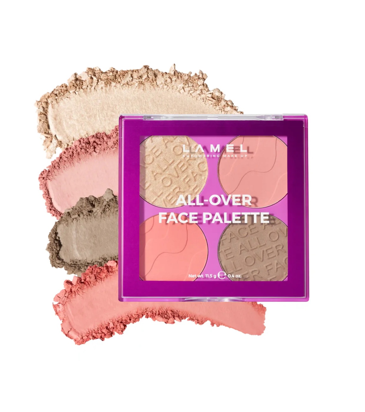 La paleta de rostro All-Over Face de Lamel incluye un iluminador, un contorno y dos tonos de colorete.