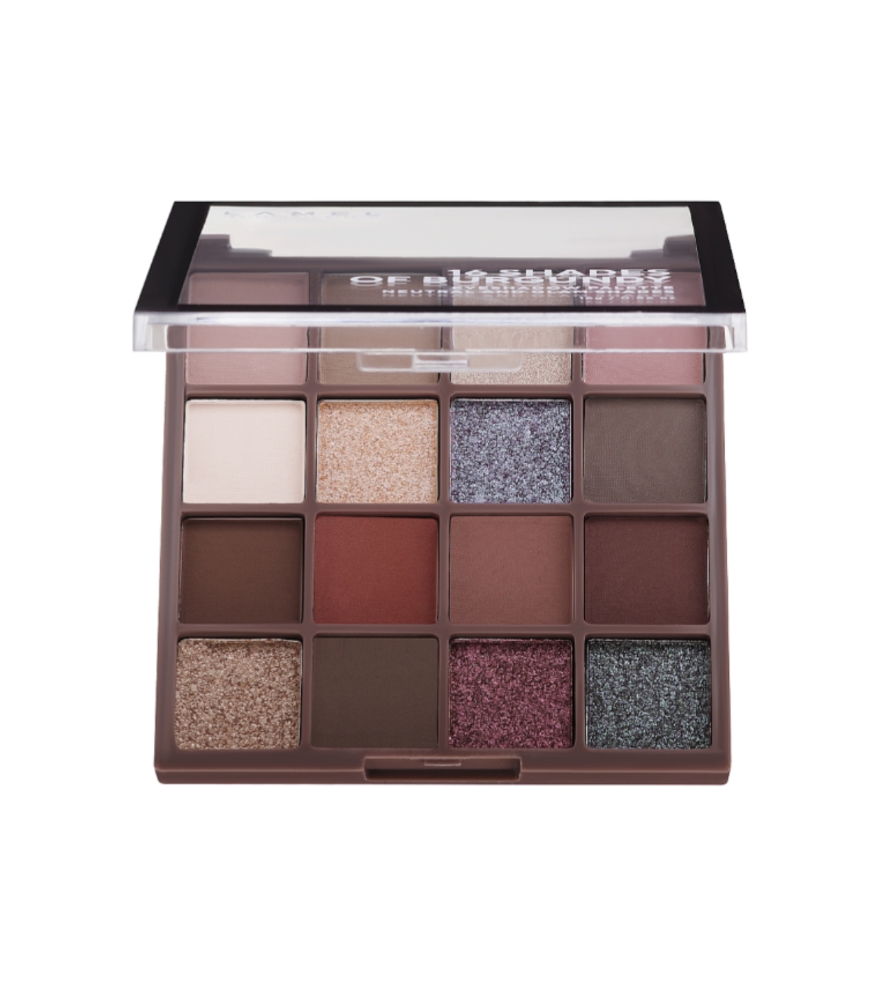 La paleta está disponible en dos gamas de colores, marrón y burdeos, y contiene 16 tonos que combinan perfectamente entre sí, lo que te permite crear tanto maquillajes ligeros para el día como maquillajes más brillantes para la noche.