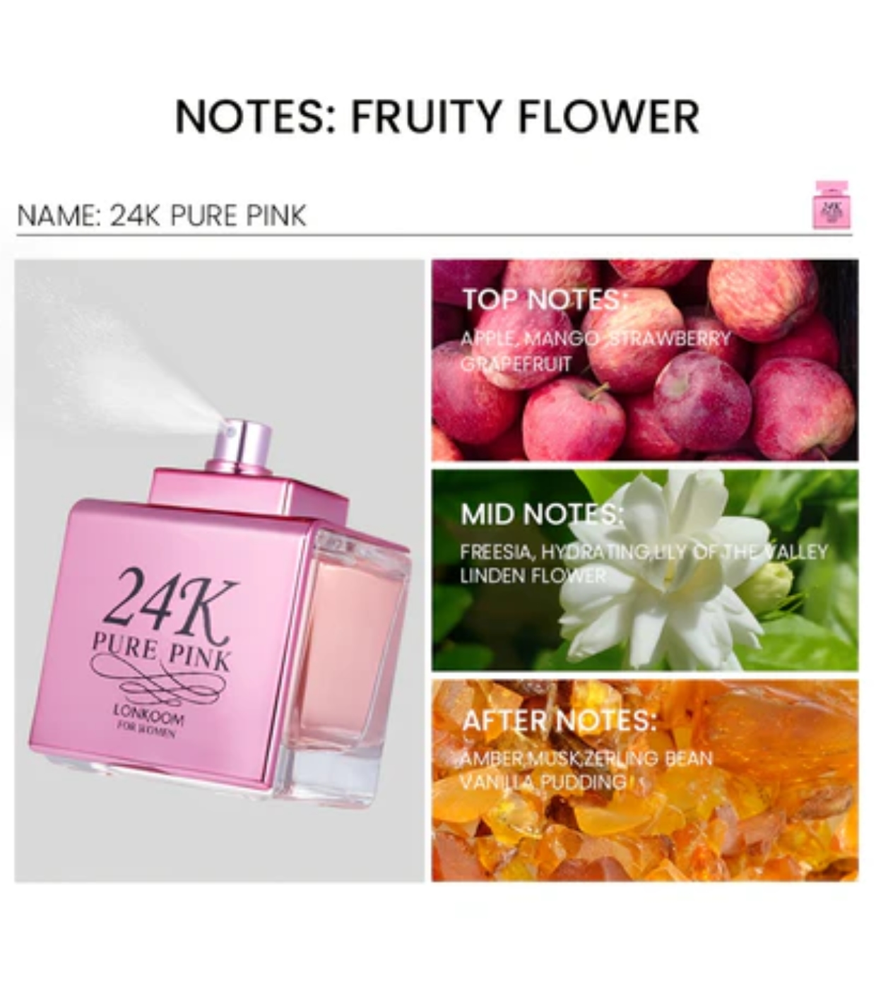 Descubre la sofisticación de LONKOOM 24K Pure Pink Eau de Parfum, una fragancia femenina que combina notas frutales y florales para una experiencia olfativa única.