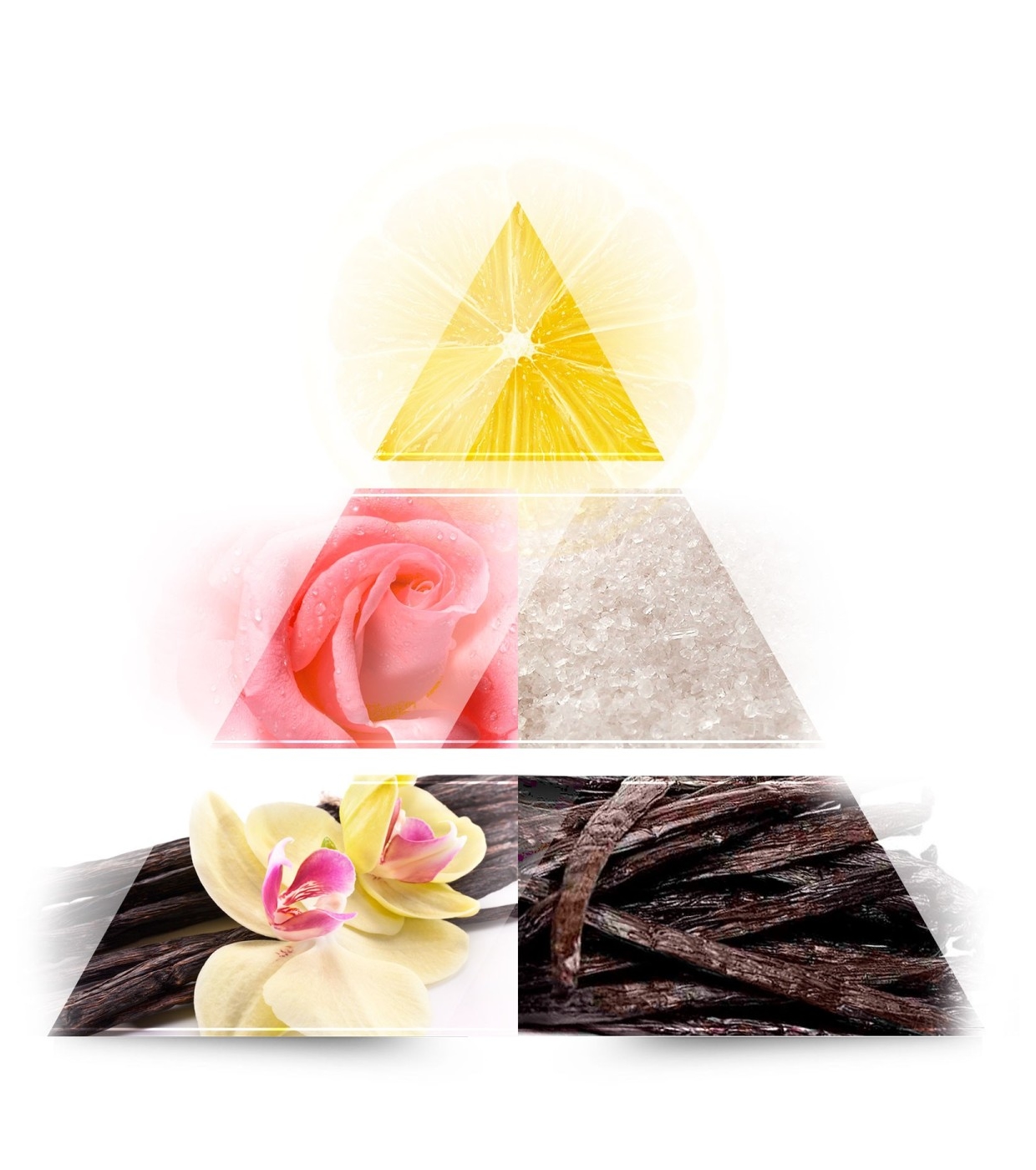 Su apertura fresca con notas de limón aporta luminosidad y ligereza, dando paso a un corazón donde la rosa se envuelve en un acorde azucarado que aporta un toque dulce y sofisticado.