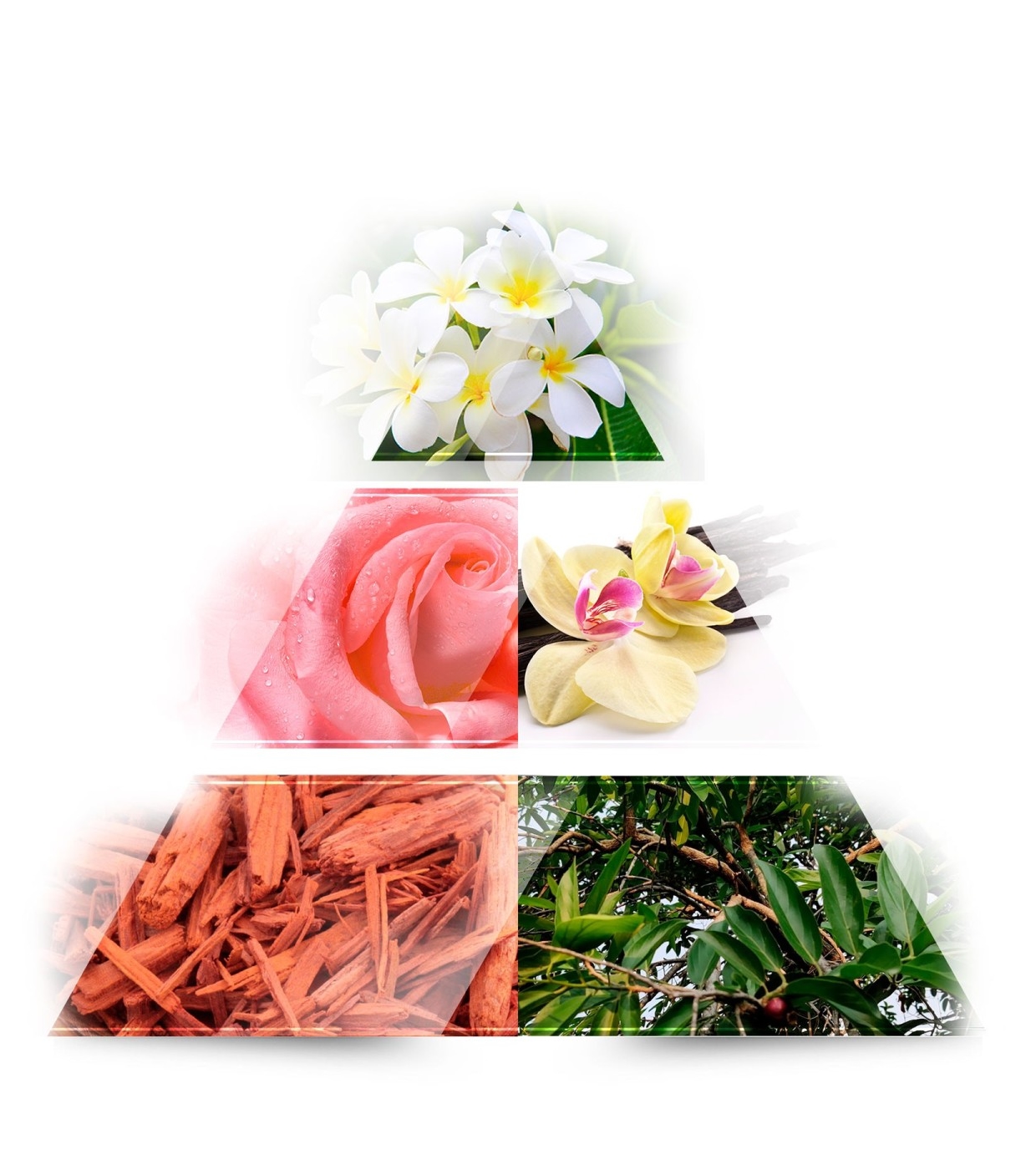 En el corazón, la rosa se funde con una vainilla aterciopelada y la frescura del lirio de los valles, creando un equilibrio elegante y envolvente. En el fondo, el almizcle y el benjuí aportan profundidad y una sensualidad íntima, mientras que el sándalo refuerza su carácter cálido y sofisticado.