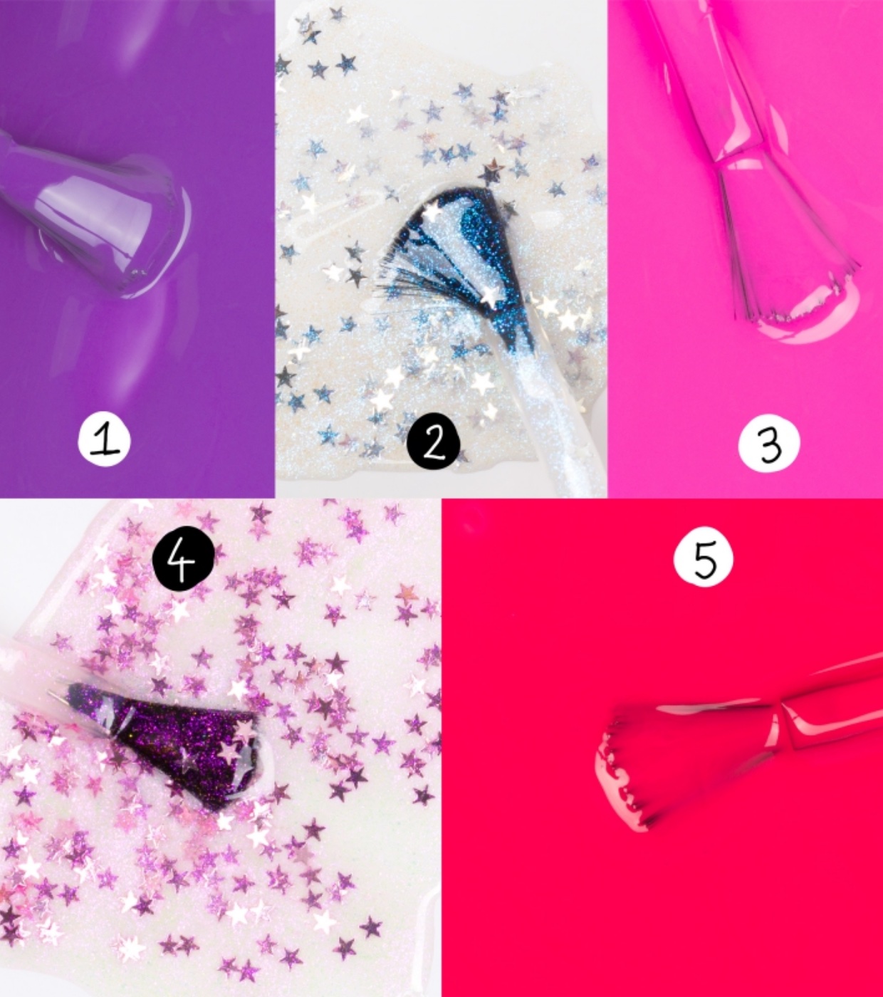 Esmaltes de uñas con suaves colores veraniegos acompañados de dos top coats con motas en forma de estrella.